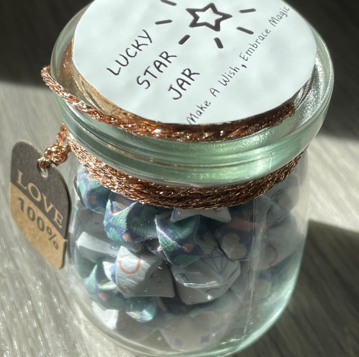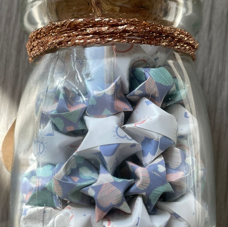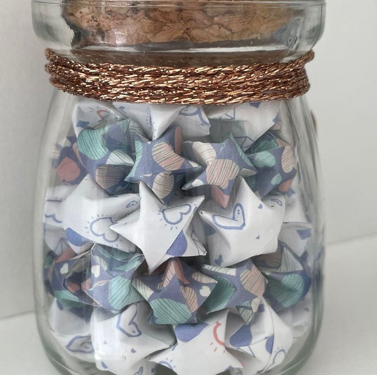 Big Star Little Star Folded Lucky Stars are folded by hand and then bottled into a pudding pot. Big Star - White coloured with heart designs,Little Star - Blue coloured with heart designs.