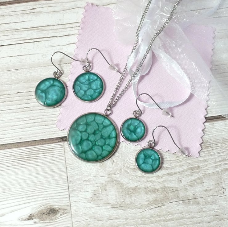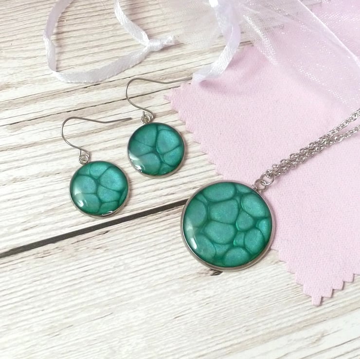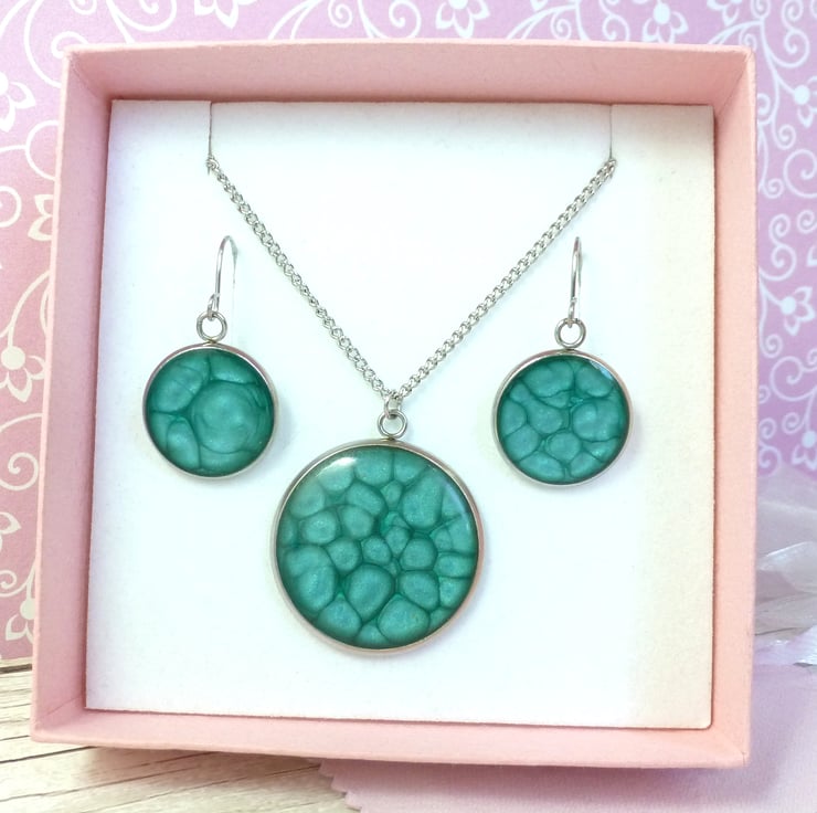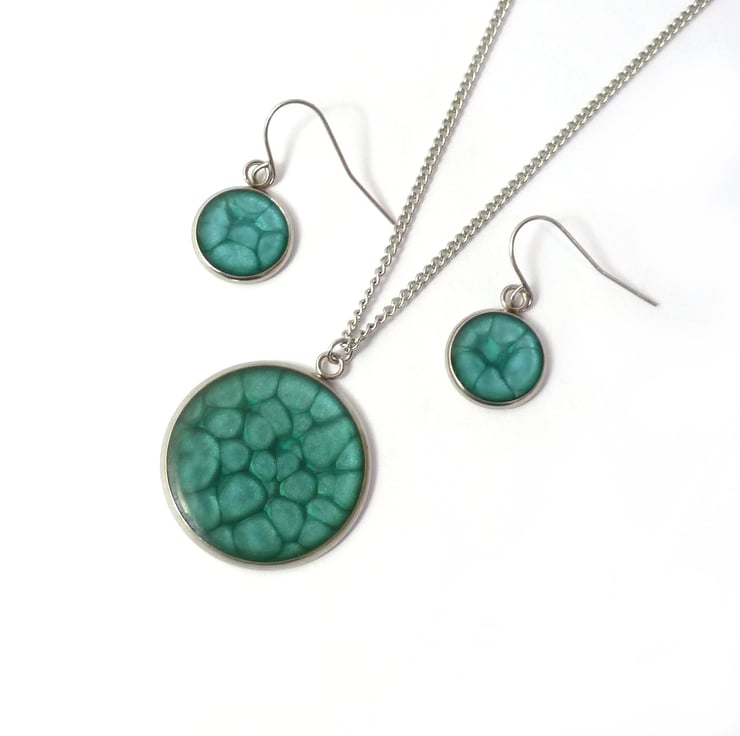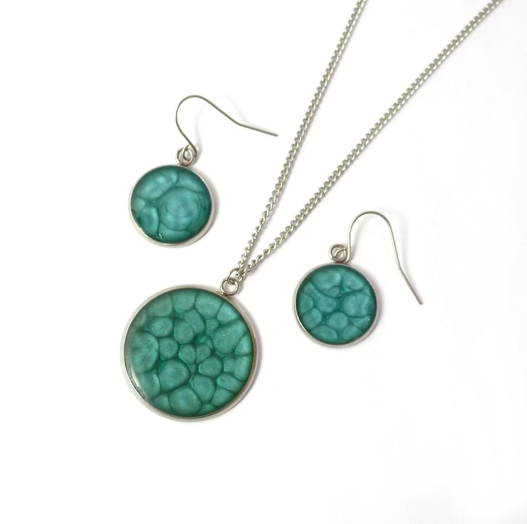 Turquoise enamel with metallic elements, topped with a hardwearing layer of epoxy resin to bring out the colour. The necklace and earrings can look brighter or darker depending on the amount of light reflected by the metallic enamel.