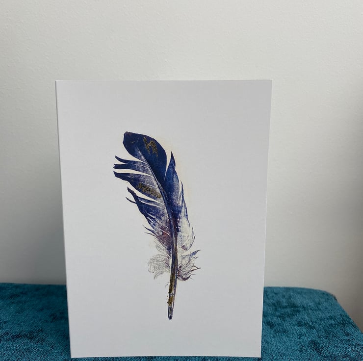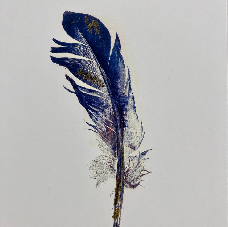 We love the countryside in all its beauty and often gather feathers when walking. We the use the feathers in a mono print print making technique, by adding ink to the feather and hand printing. This particular print is a copy of one of our original mono prints, of which we have several in our shop.