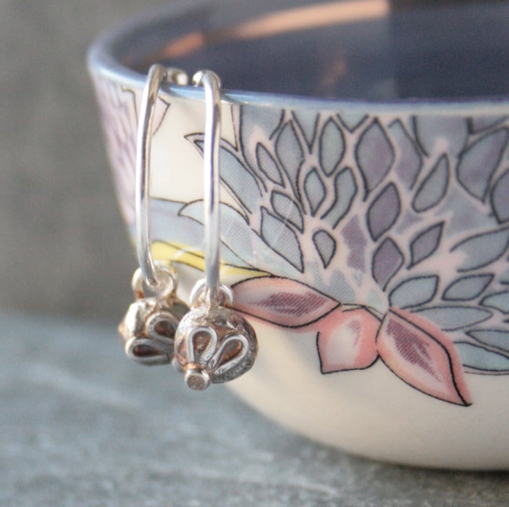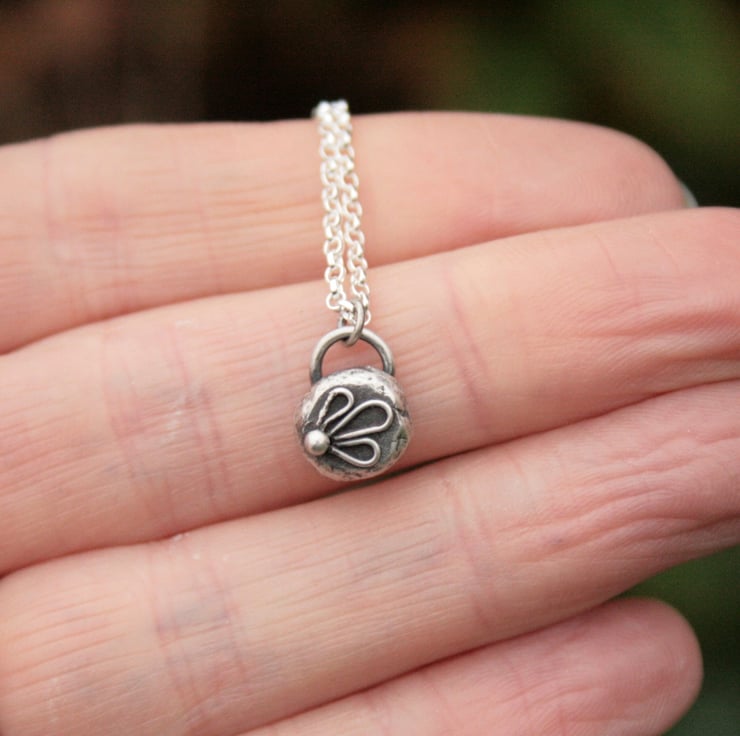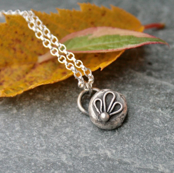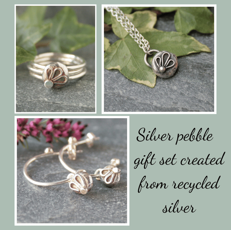 This jewellery set is a great option as a gift for someone that values sustainability in a product. Each piece is created from recycled sterling silver. The pebbles are made from melting down left over pieces of silver which form a sphere of silver, this is then hammered flat and a botanical pattern soldered to the surface.