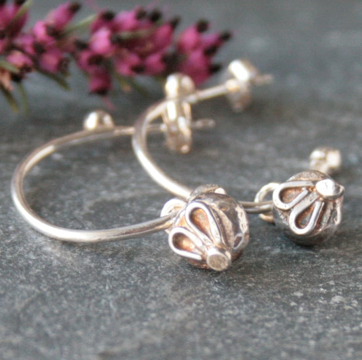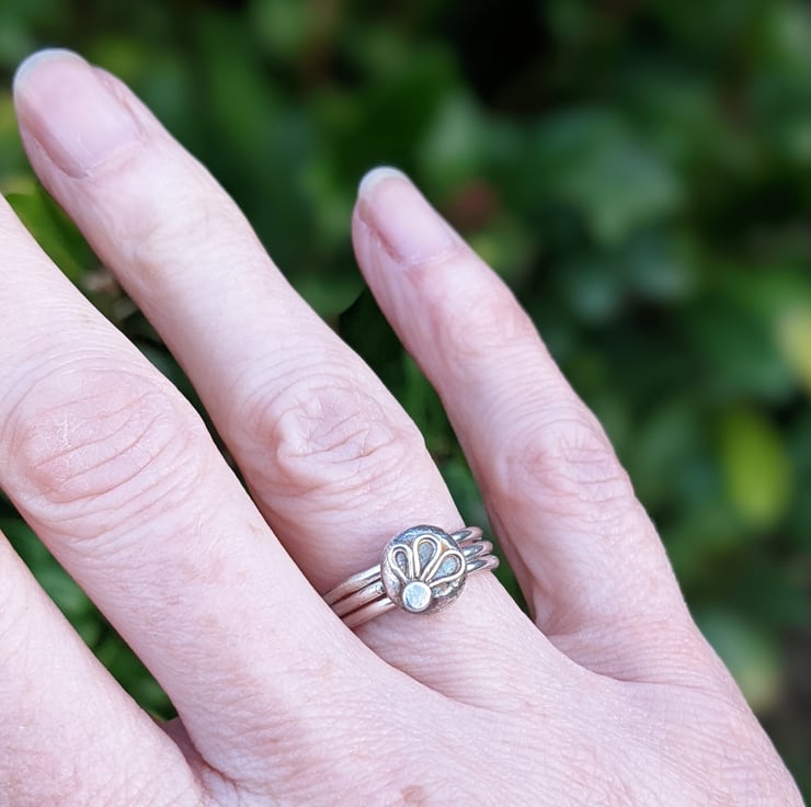 The pebble measures approximately 1 cm in diameter and you can select your chain length from the menu. The earrings have little nuggets hanging from silver hoops which have a stud fitting. The stacking rings have three sings in the set, two are plain bands and the middle one has a pebble soldered to the band. You can select your ring size from the menu.