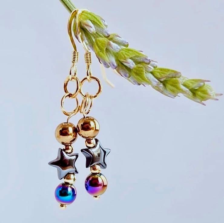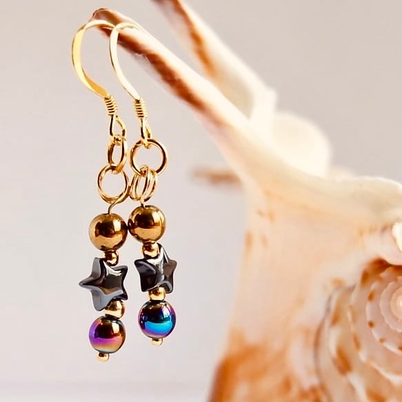 Gold vermeil ear-wires and pins threaded with a rainbow hematite bead, a sweet little hematite puffed heart and topped with a gold hematite bead.