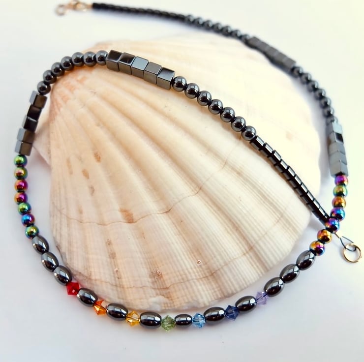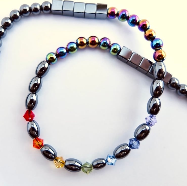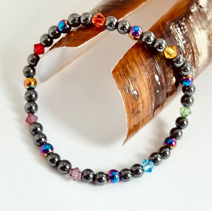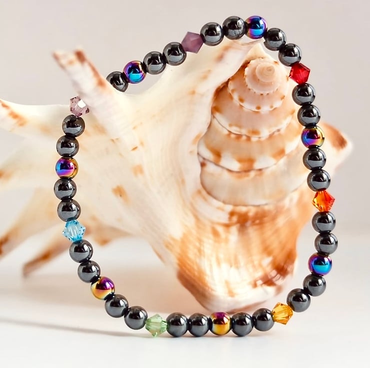 The bracelet features groups of five hematite beads, the middle one of the five being electroplated to give a metallic rainbow effect, which are separated by Swarovski crystals representing the colours of the rainbow.