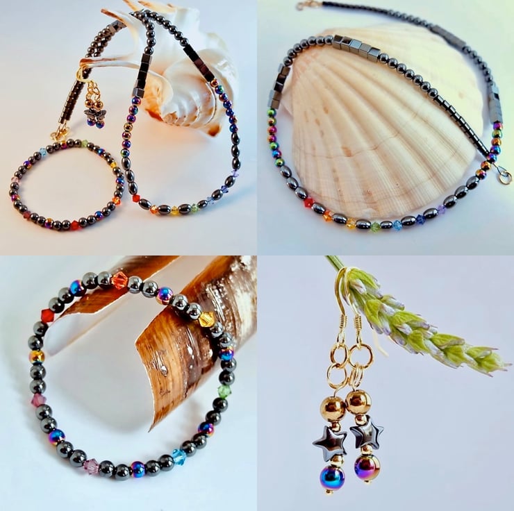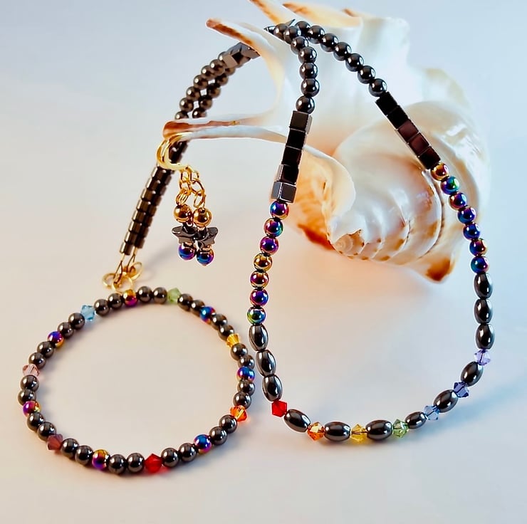 A three piece jewellery set, necklace, bracelet and earrings, featuring gunmetal Hematite, rainbow Hematite and a rainbow of Swarovski crystals.