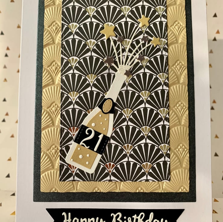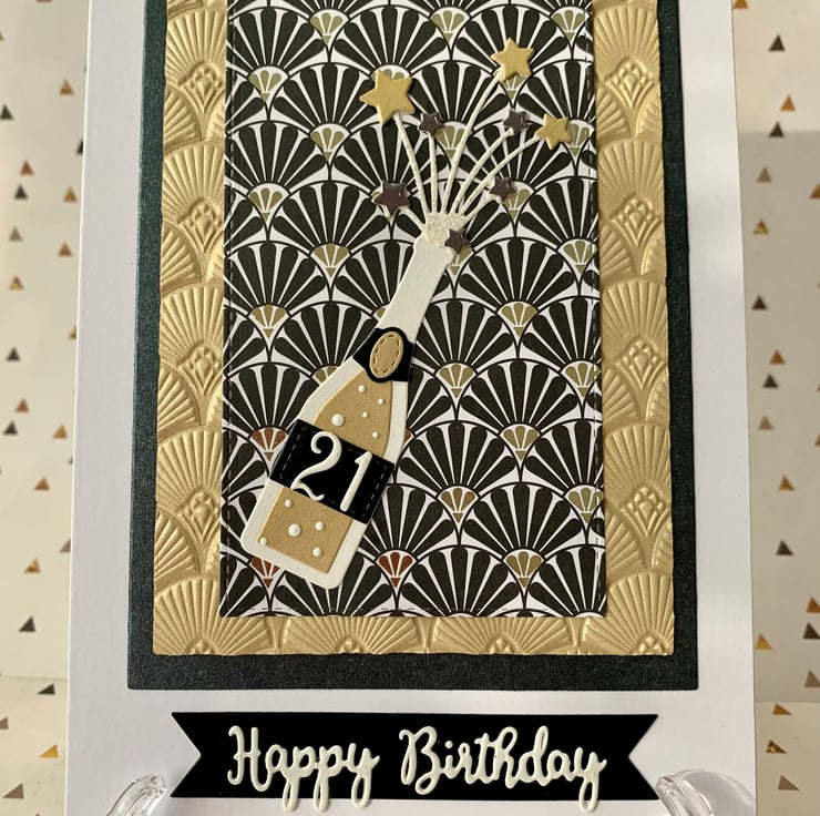 Made using die cut pieces and embossing techniques, the design is set against a fabulous art deco style background, adding some extra glamour!