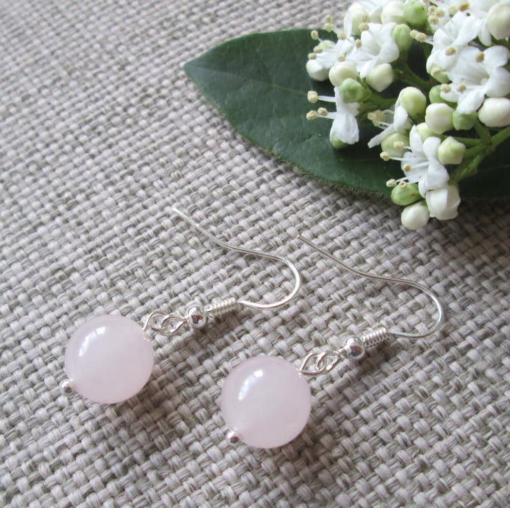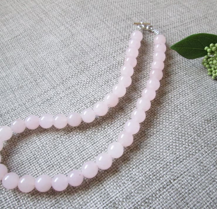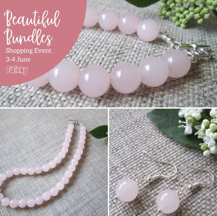 A beautiful necklace, bracelet and earrings set made with pale pink Quartzite beads (beads are 10mm in diameter), with silver-plated findings. The necklace is approximately 42cm in length, the bracelet is approximately 20cm in length and the earrings are approximately 3cm in length. A gorgeous jewellery set in a beautiful subtle colour and this is the last set available!