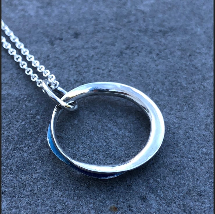 This enamel pendant is a freeform circle shape and has beautiful blue enamels on the inside. The pendant was inspired by fast flowing rivers and running water. I have used beautiful blue enamels that contrast wonderfully with the smooth, undulating waves of the silver.