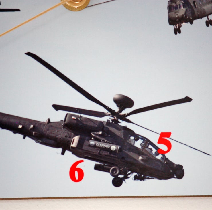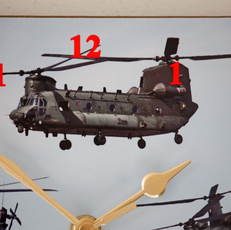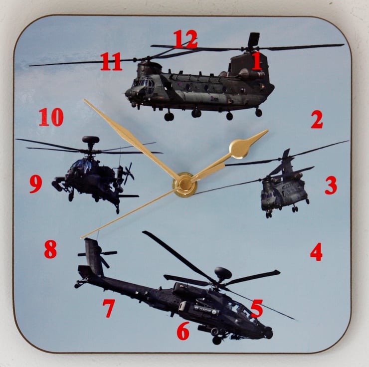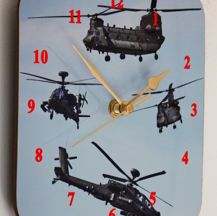 The photos of the Helicopters are by Picture That Image and are sublimated on to a 19cm square clock face which is made from 3mm thick compressed wood.