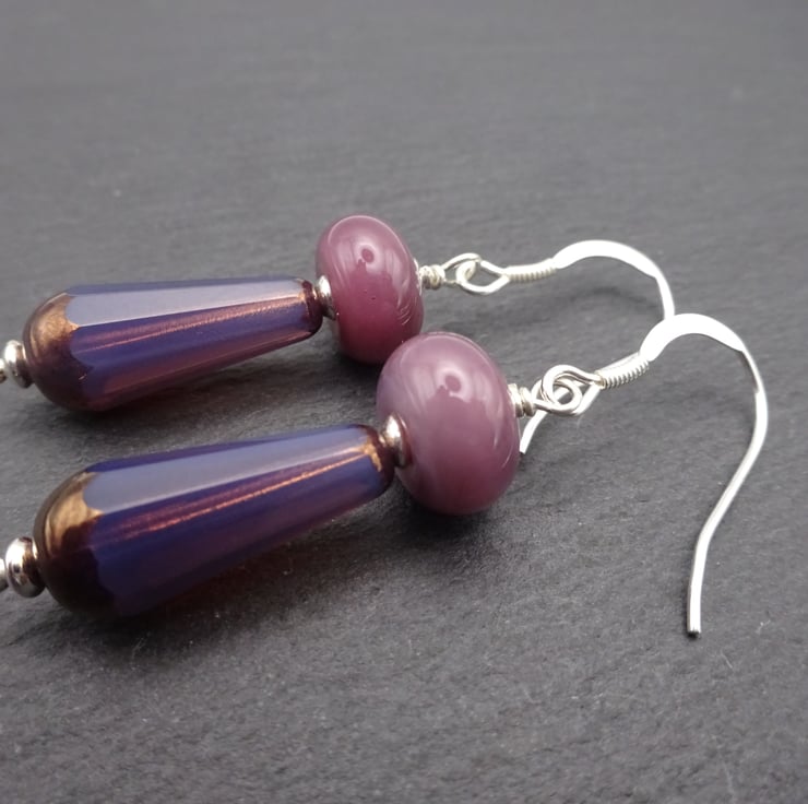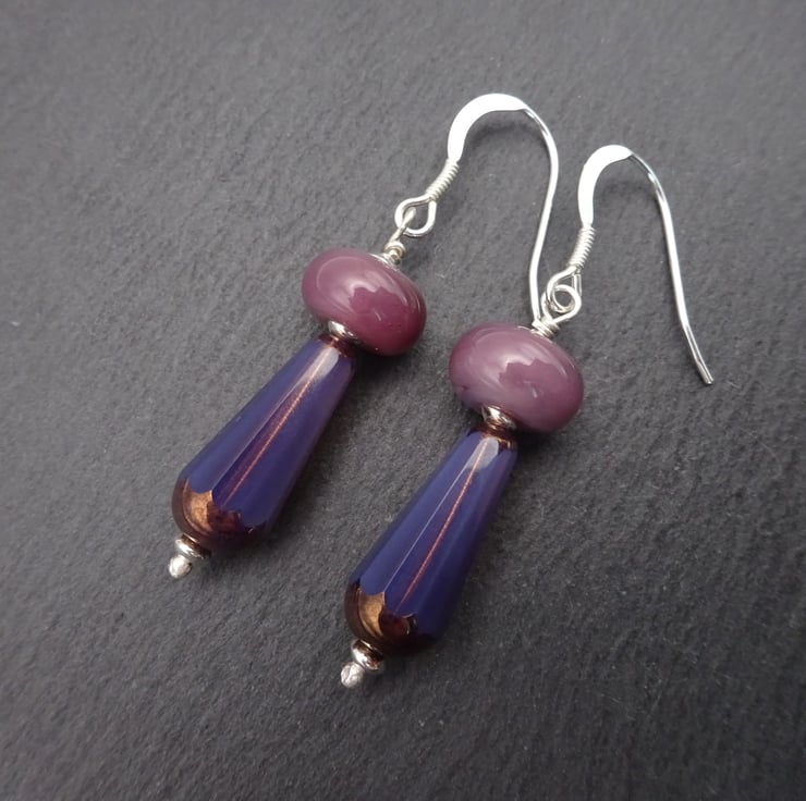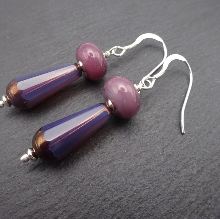 A pair of earrings made with sterling silver ear wires, sterling silver beads, handmade lampwork glass beads and Czech glass purple beads.