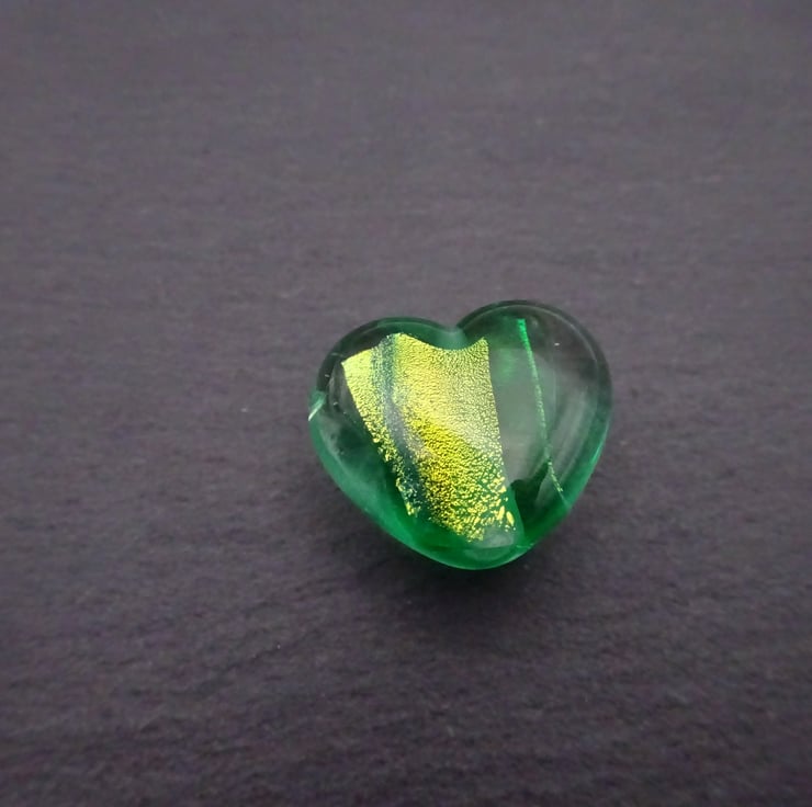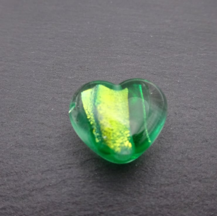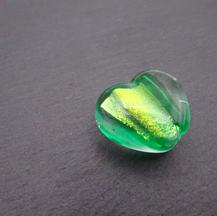 A lampwork glass bead made with green glass and shaped into a heart using a brass press. The heart features dichroic glass.