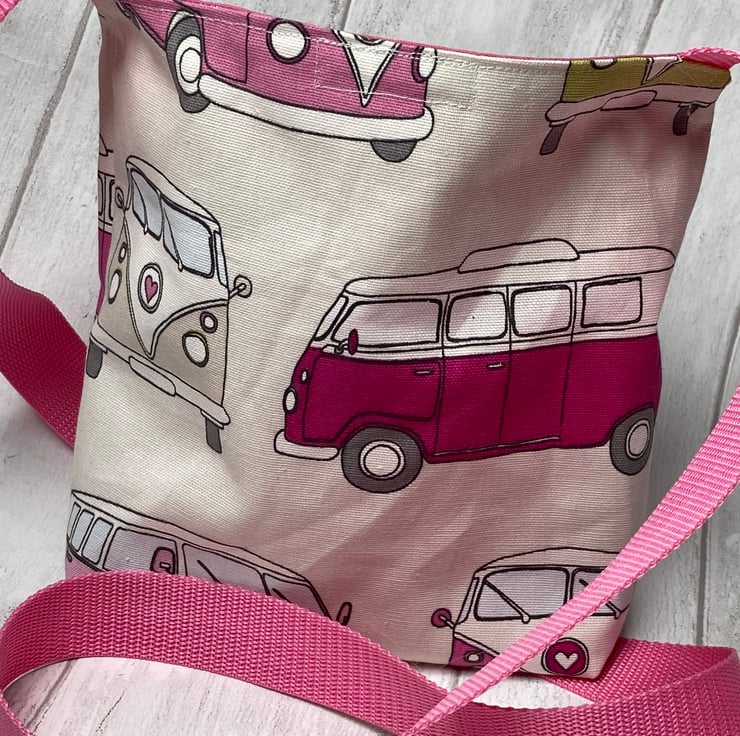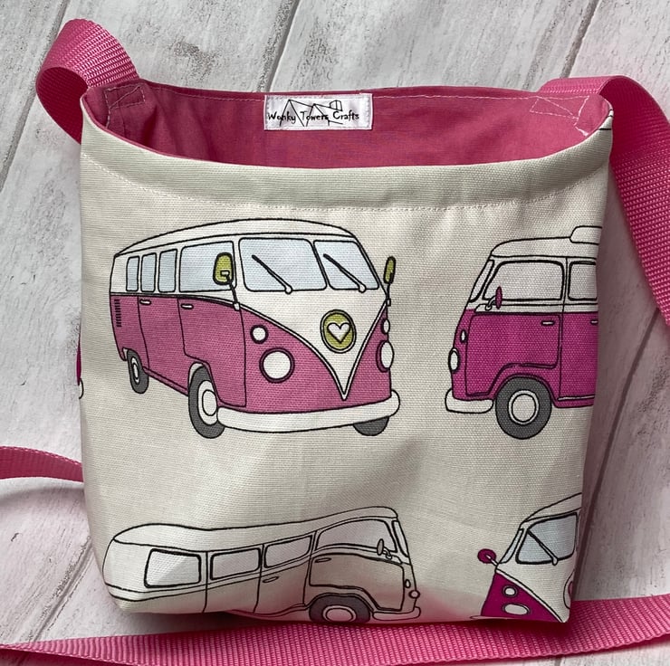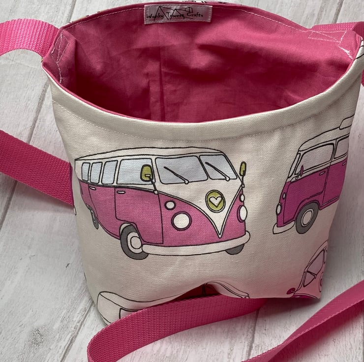 If you’re looking for a handy peg bag with a difference this may be the one for you. It is made from a high quality cotton fabric decorated with VW-style camper vans in shades of pink. It is lined with plain grey cotton and has a strong, silver grey strap. These colour details are slightly different from those shown in the photographs.