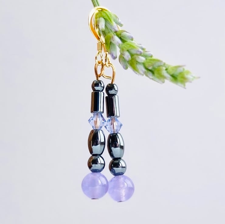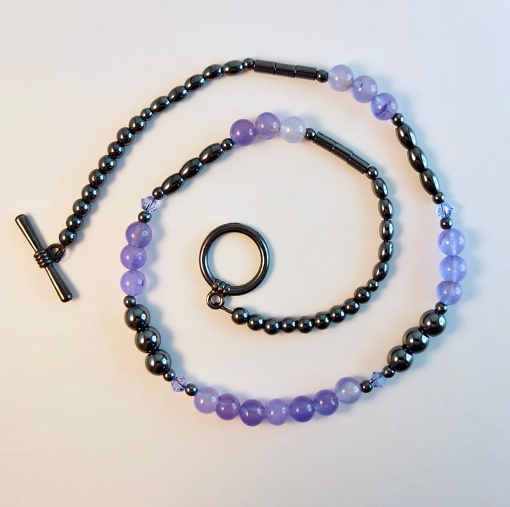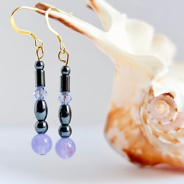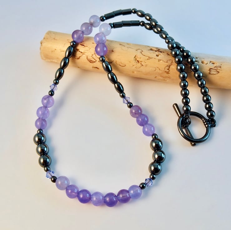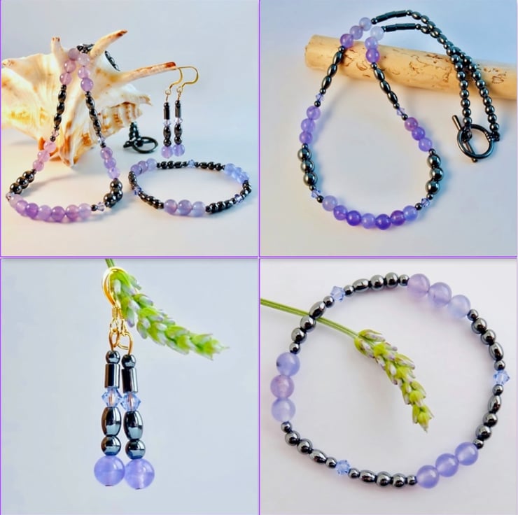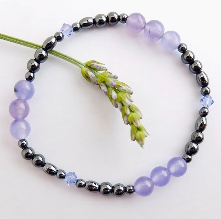 Shiny Hematite beads in 6mm and 4mm round, oval and tube are perfect to showcase these beautiful purple sky quartz beads, while a few Swarovski crystals in a complementary colour called 'Provence Lavender' add a glint of sparkle.