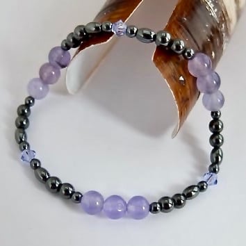 Assorted shapes and sizes of gunmetal Hematite adorned with lilac Sky Quartz and 'provence lavender' Swarovski crystal bicones.