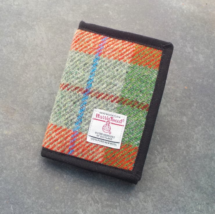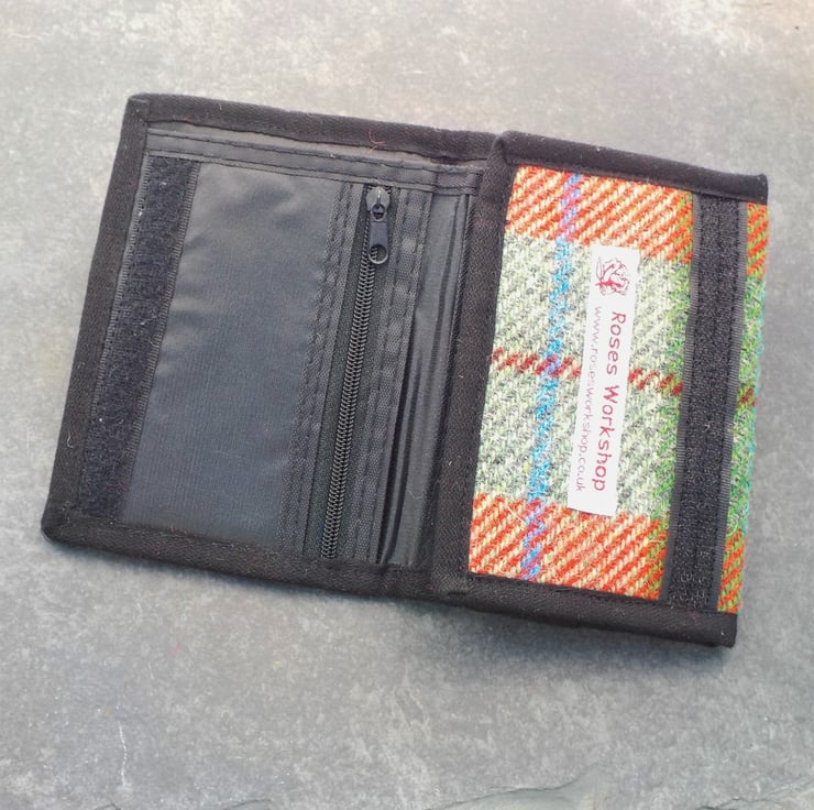 This has paired with a matching wallet in the same Harris tweed fabric. The inside is nylon with lots of pockets for notes and cards. There is a small zipped pocket for a small item such as a car-park token, not intended to hold large quantities of coins.