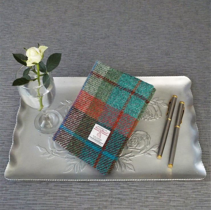 I have used genuine hand-woven Harris tweed wool fabric to make this removable book-cover, complete with the Orb label as your guarantee. I have lined the cover with toning cotton fabric and trimmed with ribbon. It comes complete with an A6 size notebook which has lined pages. When the notebook is full you can slip the cover off and insert a new one, or replace it with a diary.