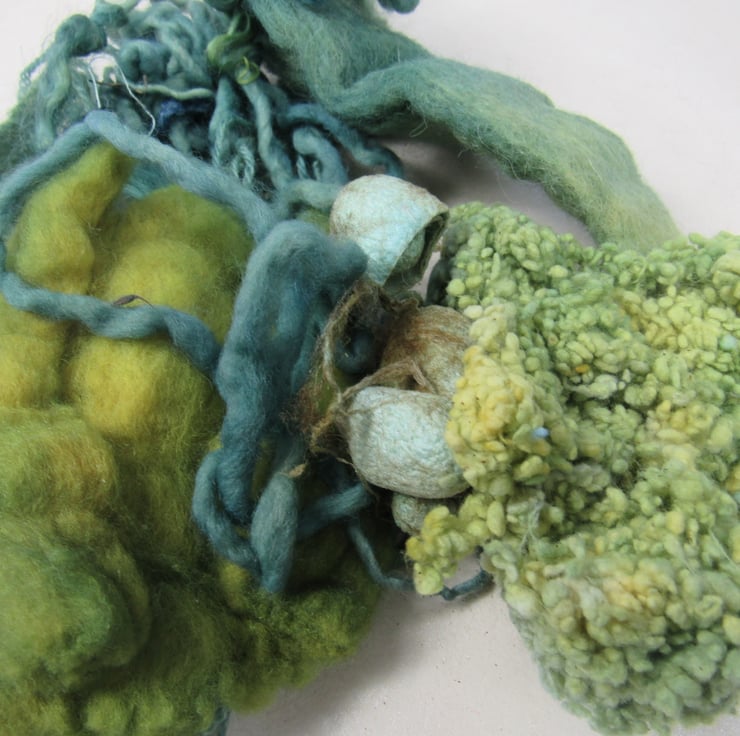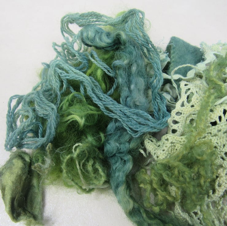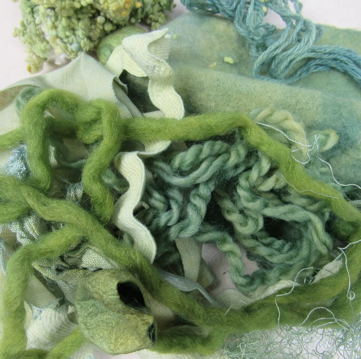 25g mixed textile and fibre scraps, naturally dyed with yellows and indigo to give a range of vibrant greens