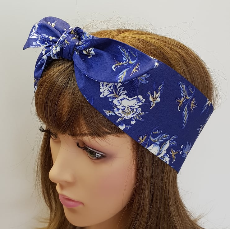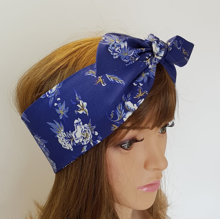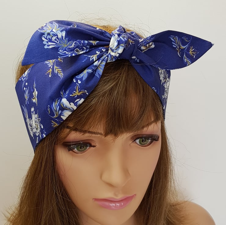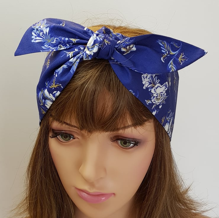 Beautiful blue floral self tie cotton head scarf , retro style hair tie, hair scarf.