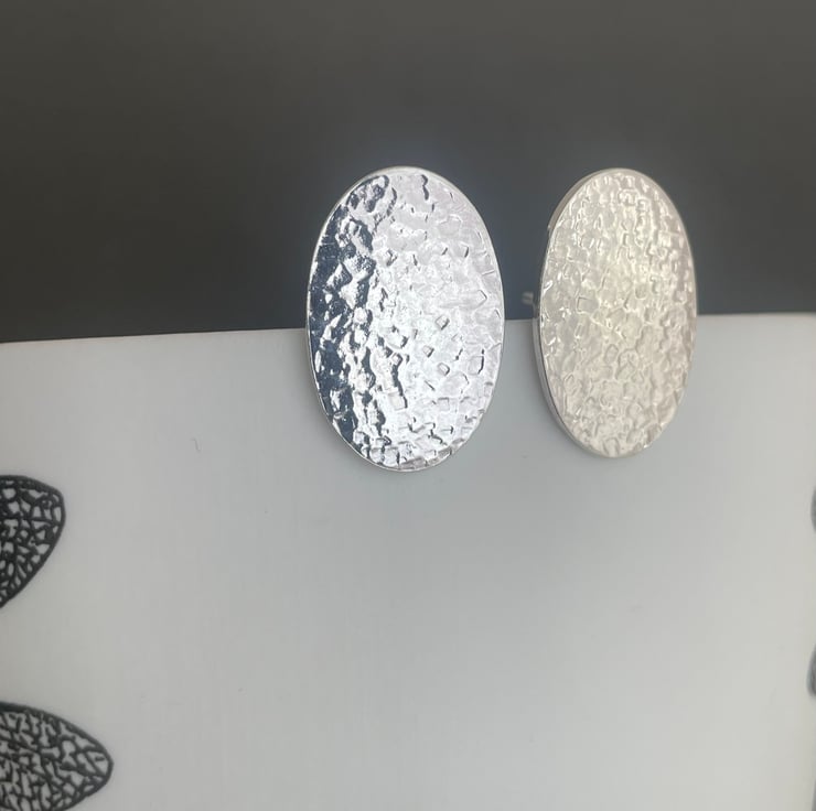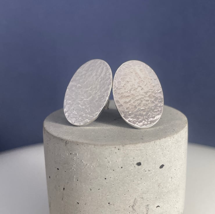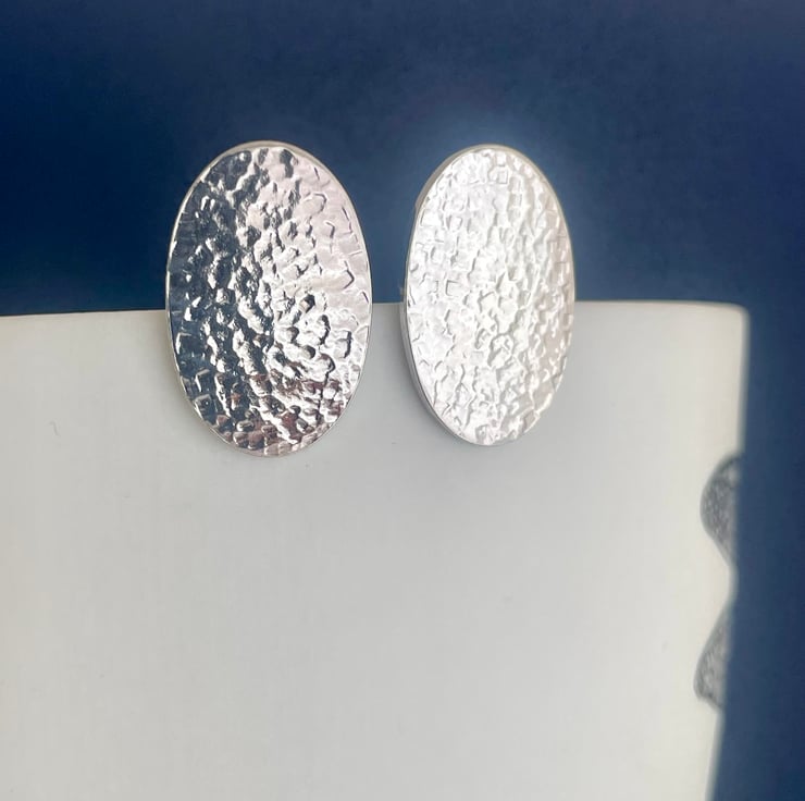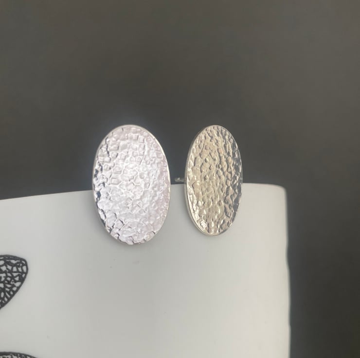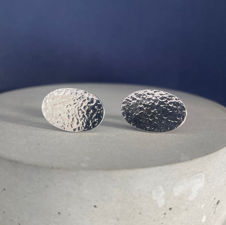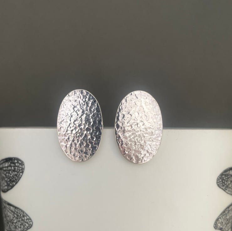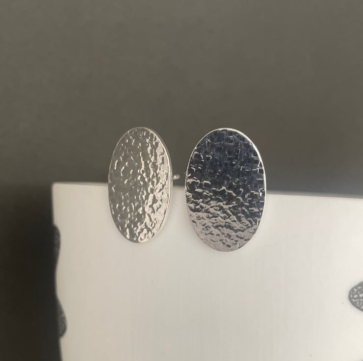 lovely pair of oval ear stud earrings handmade from 925 sterling silver. Cut out by hand from solid 1mm thick silver sheet and hammered to create their unique attractive sparkly textured surface. They have 11mm silver pin fitting’s and are secured with stamped (925 )silver scroll’s/butterfly’s.