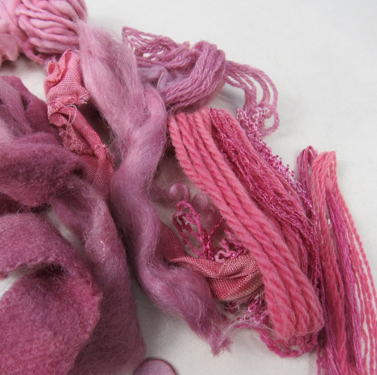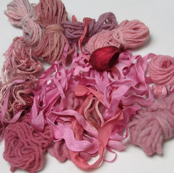 25g mixed textile and fibre scraps, naturally dyed in shades of pink.