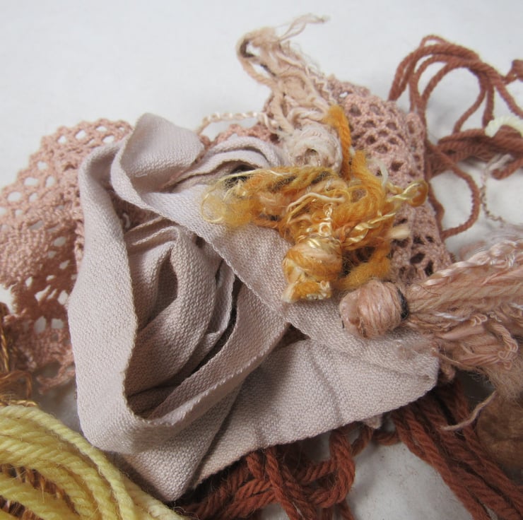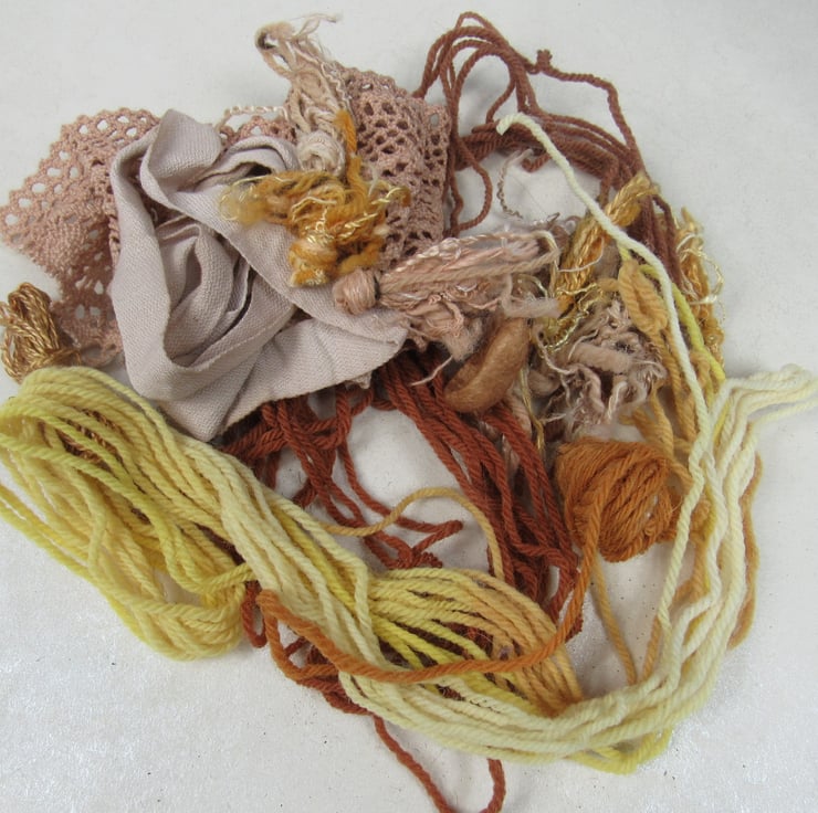 25g mixed textile and fibre scraps, dyed a range of golds and browns with natural dyes.