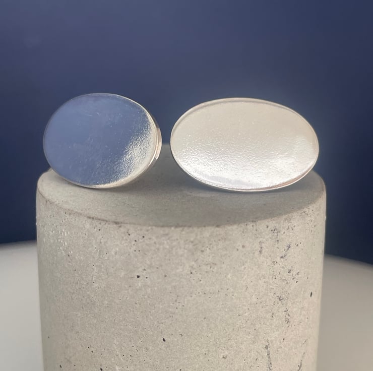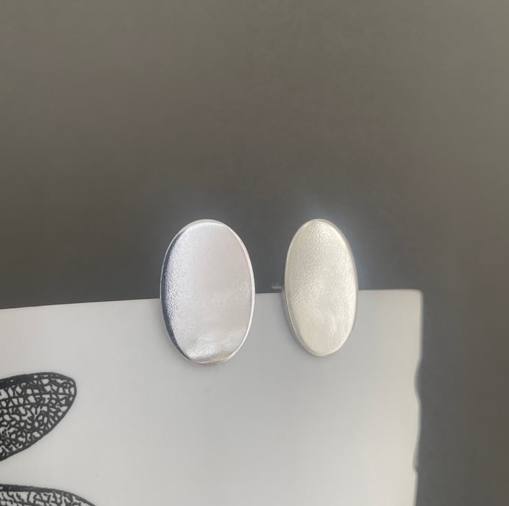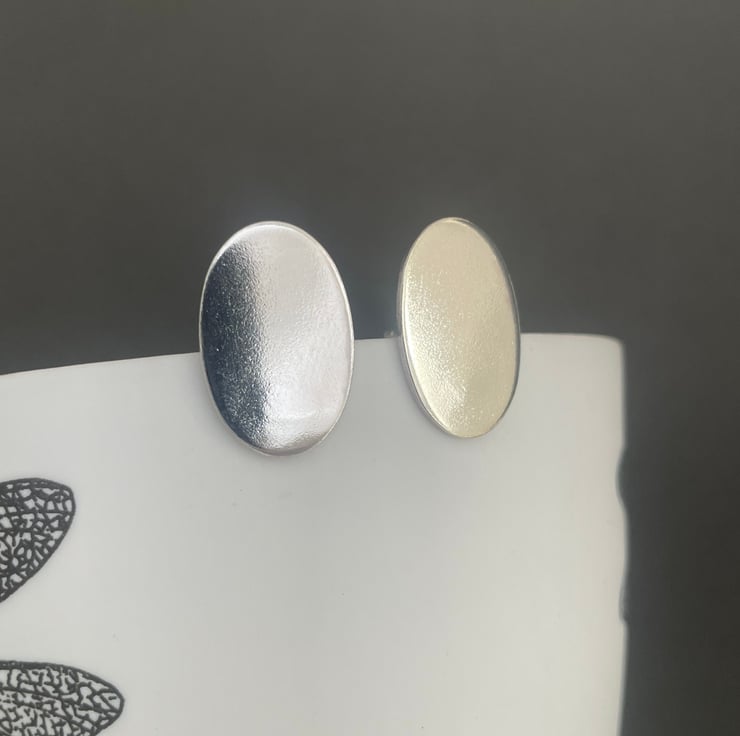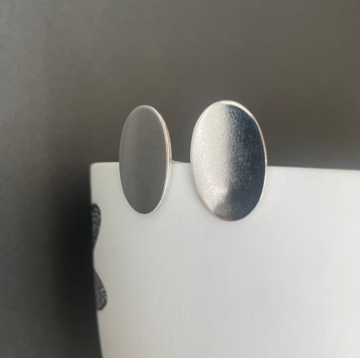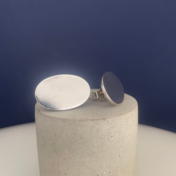 lovely pair of oval ear stud earrings handmade from 925 sterling silver. Cut out by hand from solid 1mm thick silver sheet and worked to a plain smooth surface. They have 11mm silver pin fitting’s and are secured with stamped (925 )silver scroll’s/butterfly’s.
