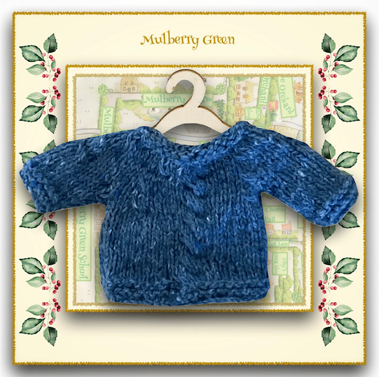A lovely jumper, knitted in blue tweed wool, with a cable at the front, to fit the Mulberry Green characters. The jumper goes well with jeans or blue cord trousers.