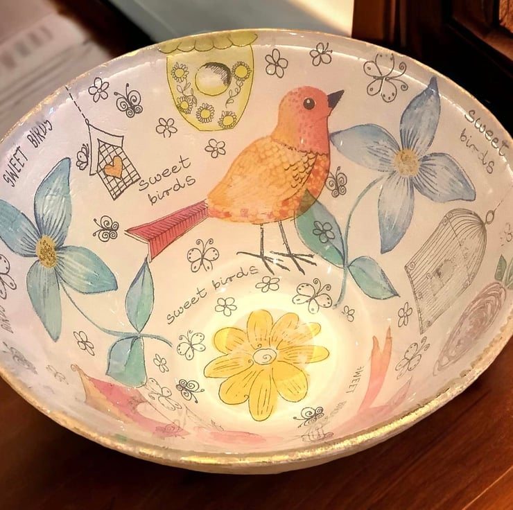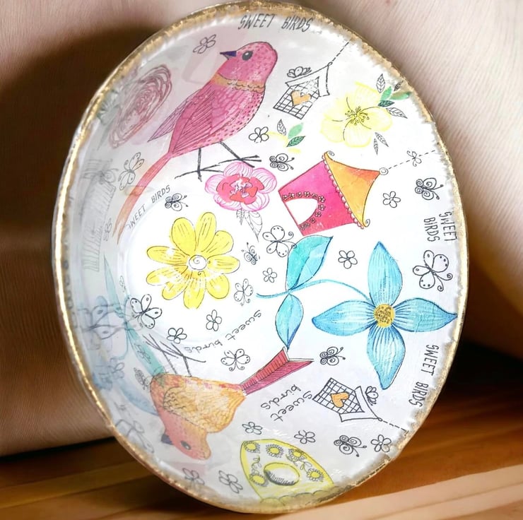 The image to inside of bowl has been applied using reverse decoupage. Acrylic paint and mulberry paper create a textured feel to outside of bowl. Smaller images of the design and gold leaf to rim make this a perfect creation. Pearlescent glaze give a subtle shine. It will arrive gift wrapped.