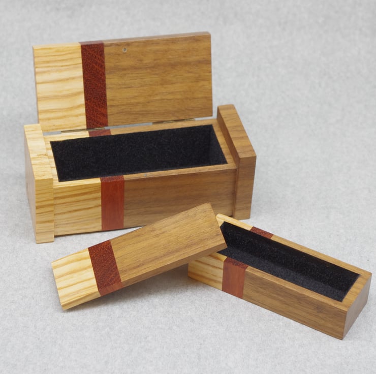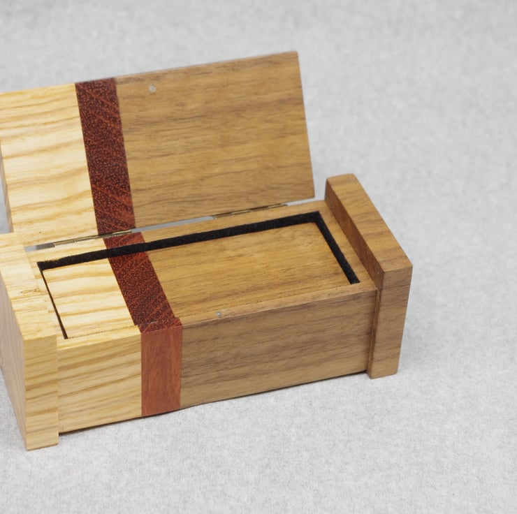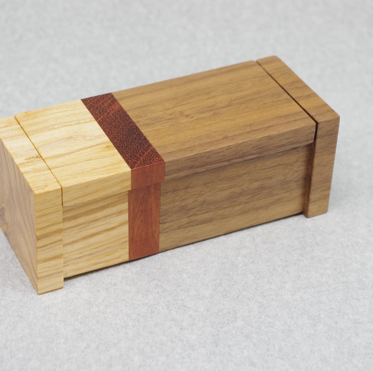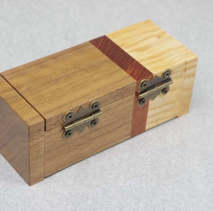 This delightful box is made from a mixture of Ash, Bubinga and Walnut.