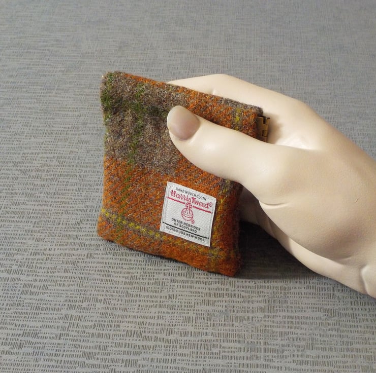 The flex top purse is a great way to hold change, and easy to fit into a pocket. Or keep it in the glove box for tolls and car-park charges. I have made this one from a brown and orange tartan design of the world renowned Harris tweed fabric for the outside, and a toning cotton fabric for the lining. It closes with a flex or spring top to keep your change safe; press the ends inwards and the middle springs open, release them and the top springs closed again. This purse measures approx. 10cm square.