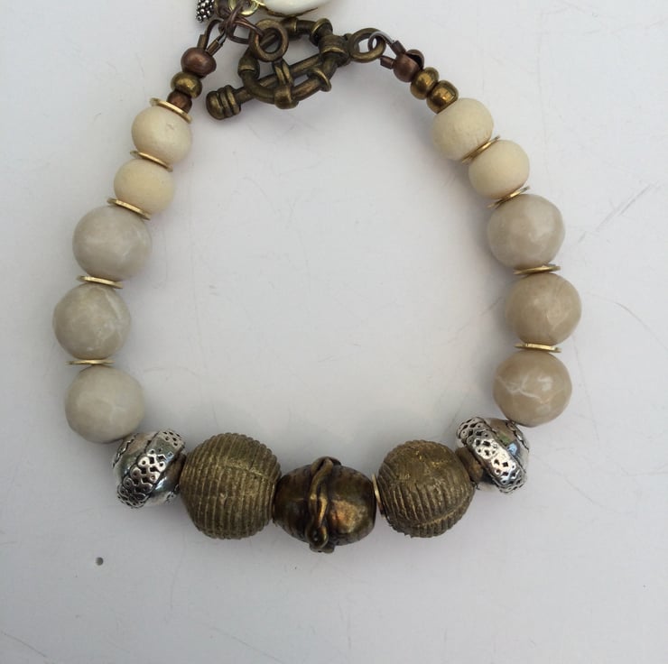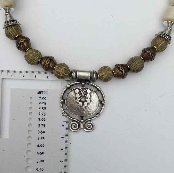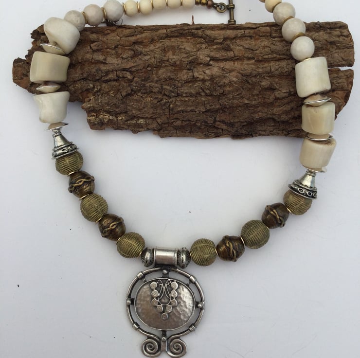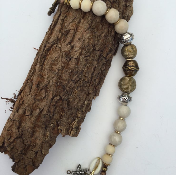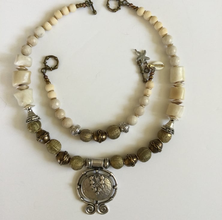 This is an elegant statement pendant necklace featuring an unusual silver plated pendant flanked by hand made African brass beads and copper coloured brass beads. The African brass beads are made using the ancient lost wax method, consequently each one is unique. The brass beads are contrasted by chunks of cream bamboo (deep sea) coral, cream fossil coral riverstone and sandalwood beads. The bracelet consists of similar beads and features two tiny charms - a star fish and an enamel shell.