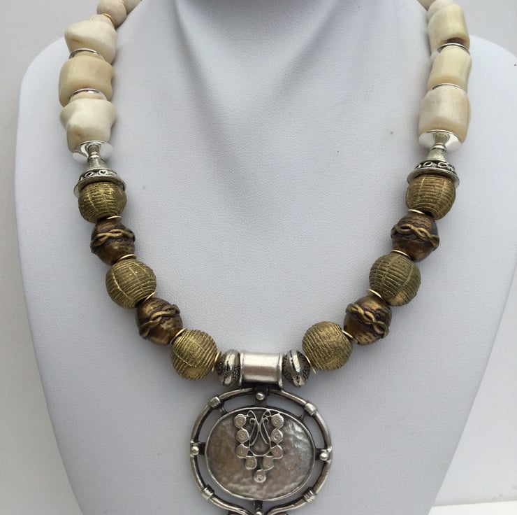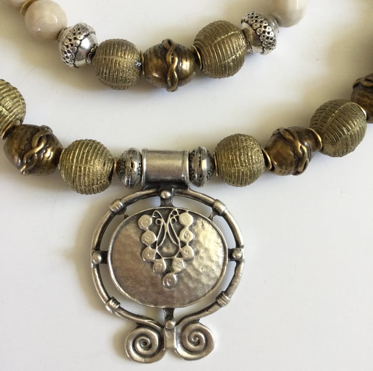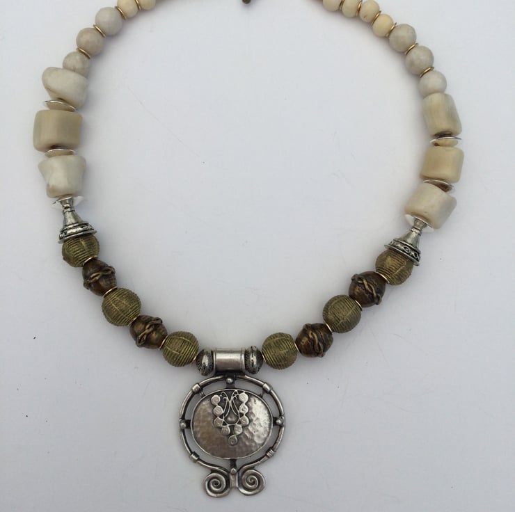 I try and collect unusual stones and pendants from various places and like to combine different elements in unusual combinations. I sourced this pendant in Turkey and the beads came from Africa, the United States and Tibet.