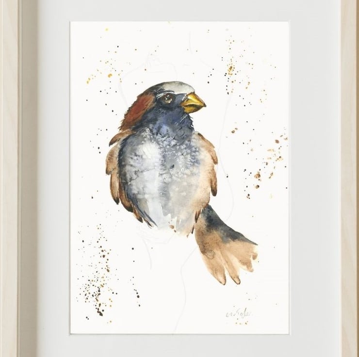 A limited edition print of a sparrow inspired by the birds that surround me on the canals of England where I live. This print captures the bird's intricate feather patterns and subtle colour variations. The painting details a more abstract interpretation of the sparrow, the watercolour medium provides a sense of fluidity, which can be used effectively to showcase the bird's swift movements. This watercolour print is a representation of the vibrant, spirited bird commonly found around the world.
