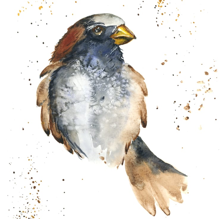 An original watercolour of a sparrow inspired by these birds that surround me on the canals of England where I live. This painting captures the bird's intricate feather patterns and subtle colour variations. The painting details a more abstract interpretation of the sparrow, the watercolour medium provides a sense of fluidity, which can be used effectively to showcase the bird's swift movements. This watercolour art is a representation of the vibrant, spirited bird commonly found around the world.