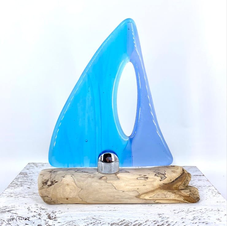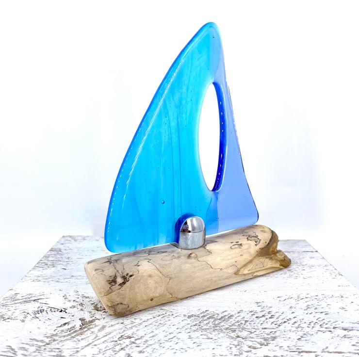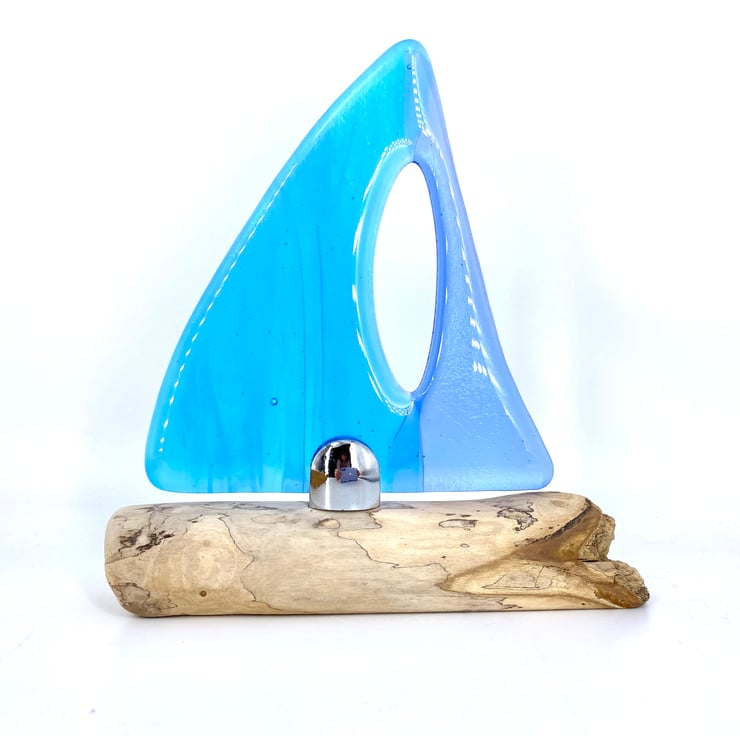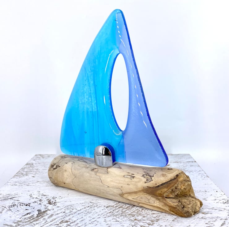 A gorgeous decorative sailing boat. Beautiful light blue & wispy turquoise fused glass sails set on a gorgeous piece of drift wood which had been washed up on the Devon coastline.