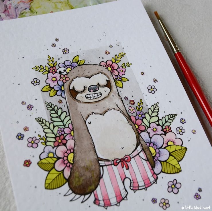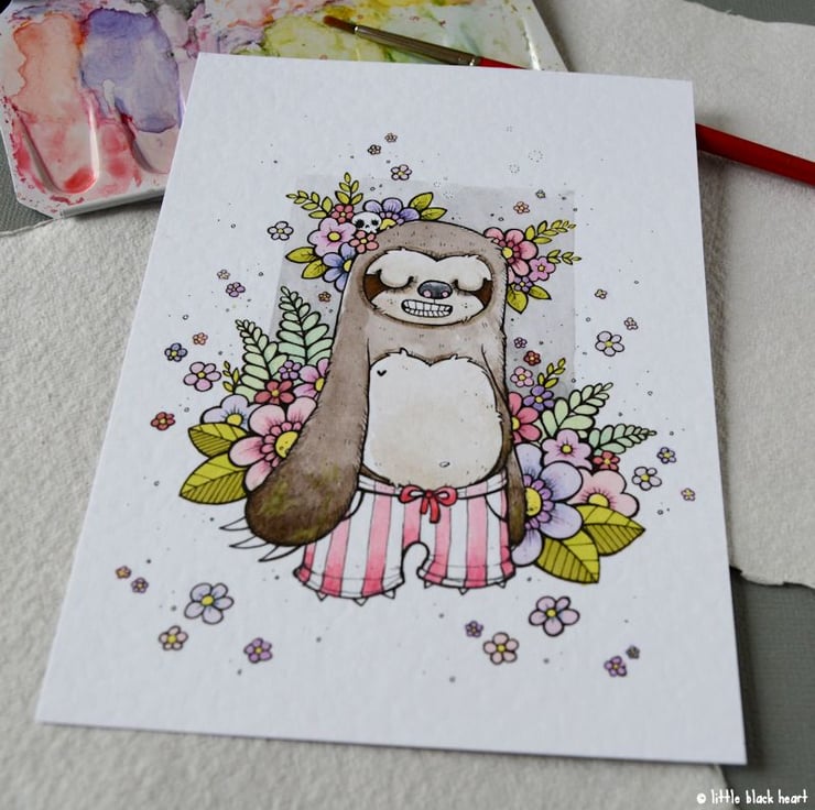 a sleepy floral sloth in his striped pyjamas, surrounded by blossoms and blooms, and dreaming of taking things easy.