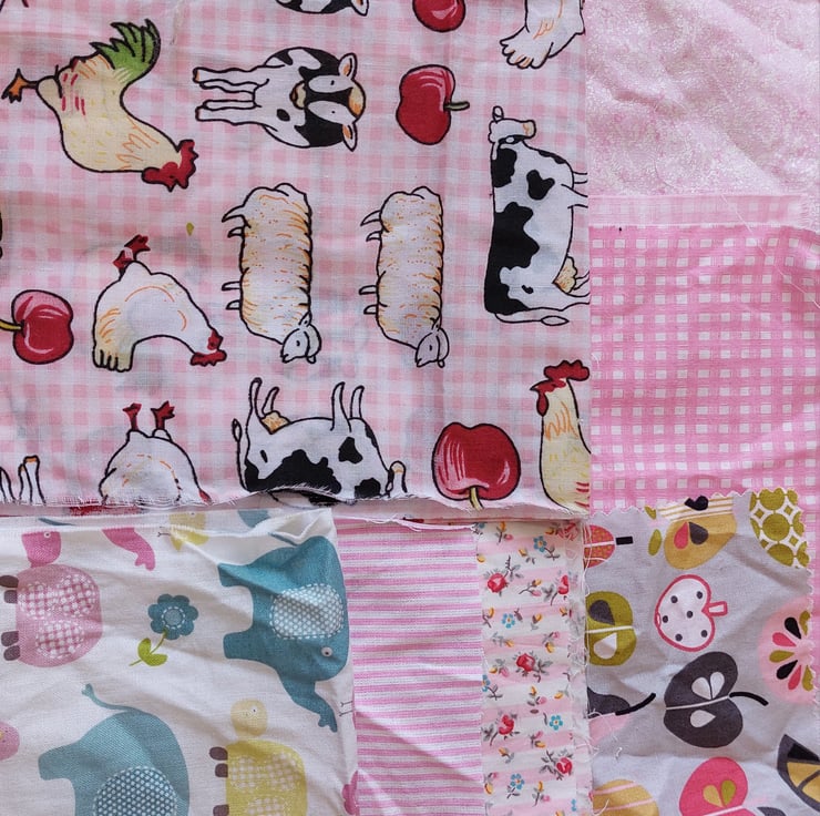 Mama bird has been tidying the nest! Fabric remnants bundle. Mostly cotton. Ideal for quilting, applique, textile art and other crafts. Pack contains several good sized pieces of funky pink prints and other usable remnants. Please see photos for dimensions. Clean and mostly unused, but may need an iron.