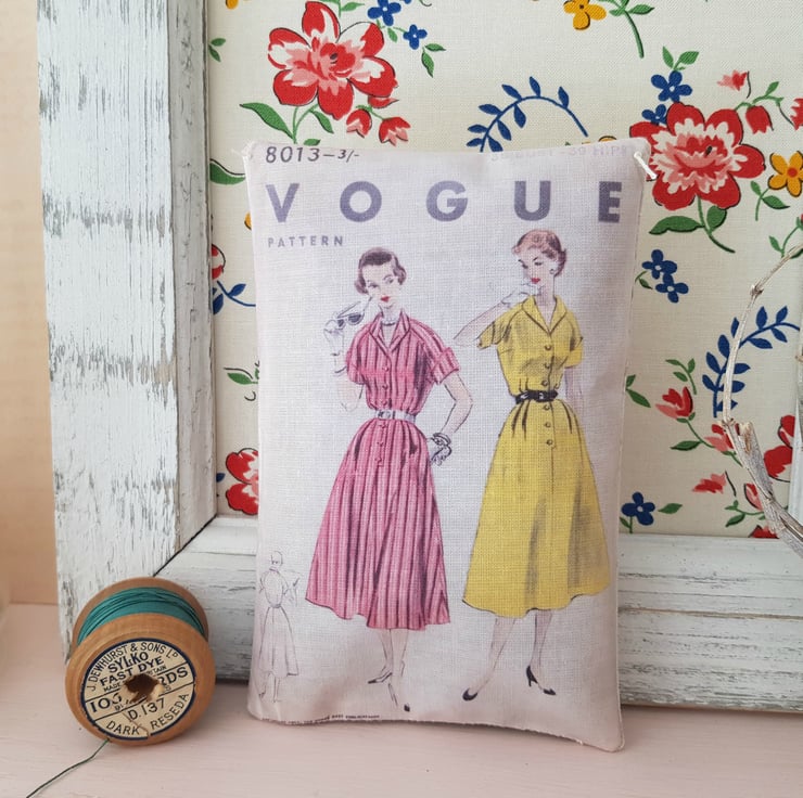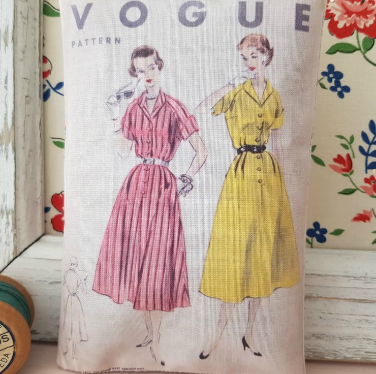 This lovely vintage Vogue sewing pattern illustration has been hand printed onto fabric, backed in a coordinating fabric and scented with lavender or rose petals.