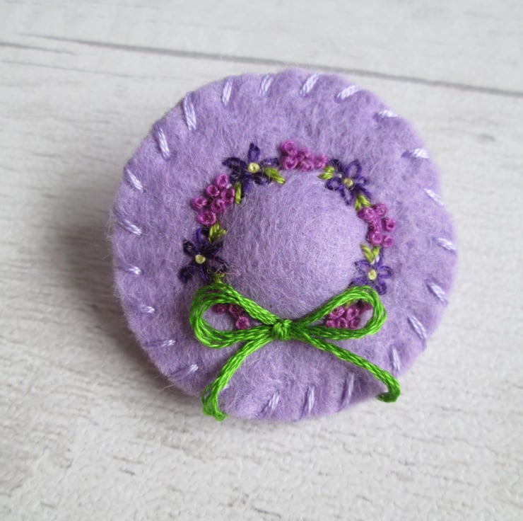 The second of my 'summer hat' brooches - this time in lilac wool felt. After shaping, this 4.5 cm diameter hat has been carefully hand embroidered with tiny purple clematis and sprays of magenta lilac flowers, then finished with a vivid green bow and fitted with a metal brooch clasp. It is presented in a small drawstring gift bag made from a fine linen remnant, and would look equally at home on a posh frock or denim jacket.