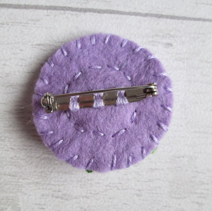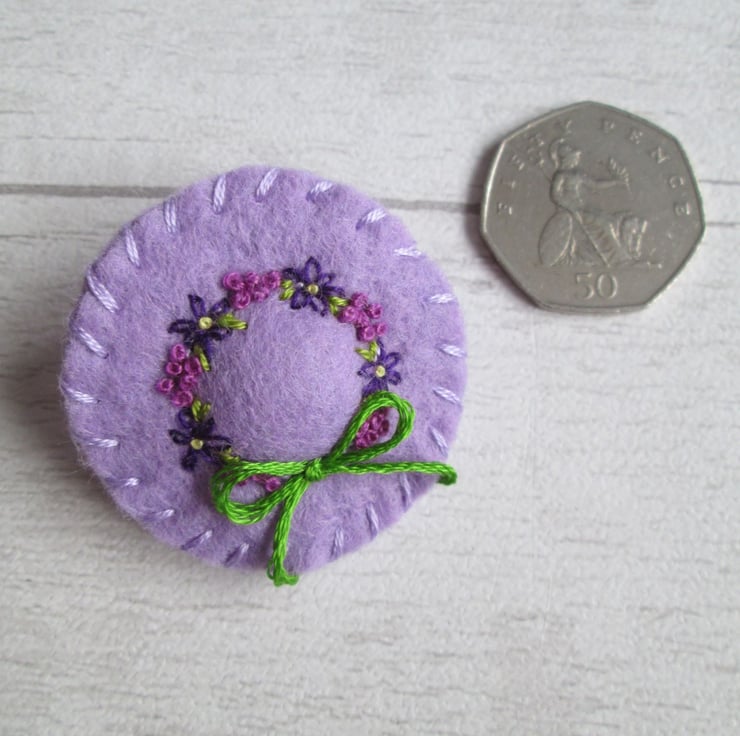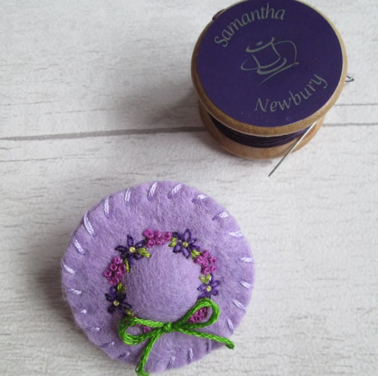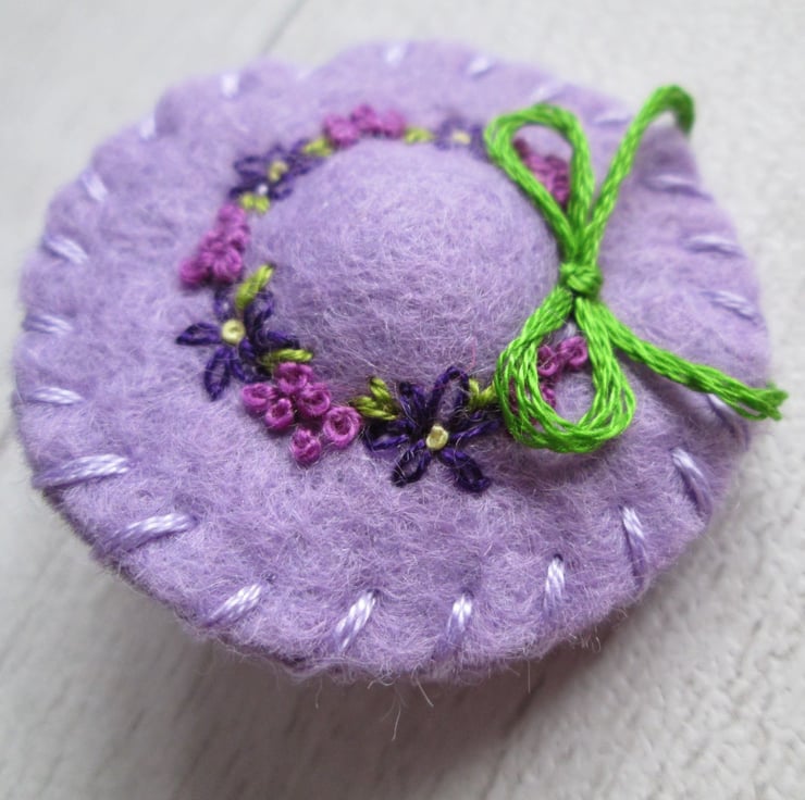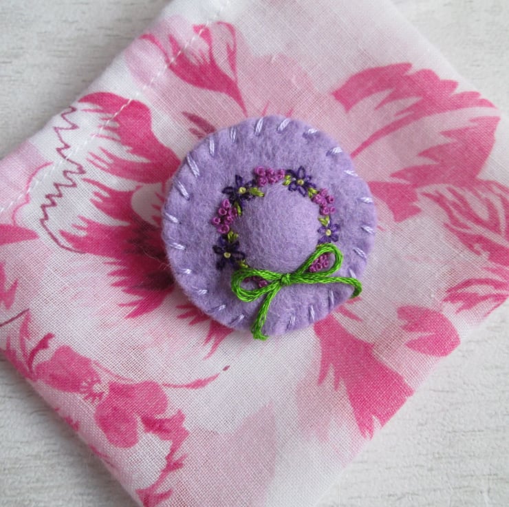 The second of my 'summer hat' brooches - this time in lilac wool felt. After shaping, this 4.5 cm diameter hat has been carefully hand embroidered with tiny purple clematis and sprays of magenta lilac flowers, then finished with a vivid green bow and fitted with a metal brooch clasp. It is presented in a small drawstring gift bag made from a fine linen remnant, and would look equally at home on a posh frock or denim jacket.
