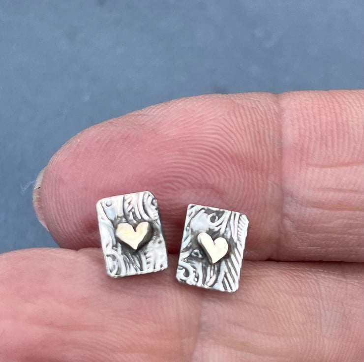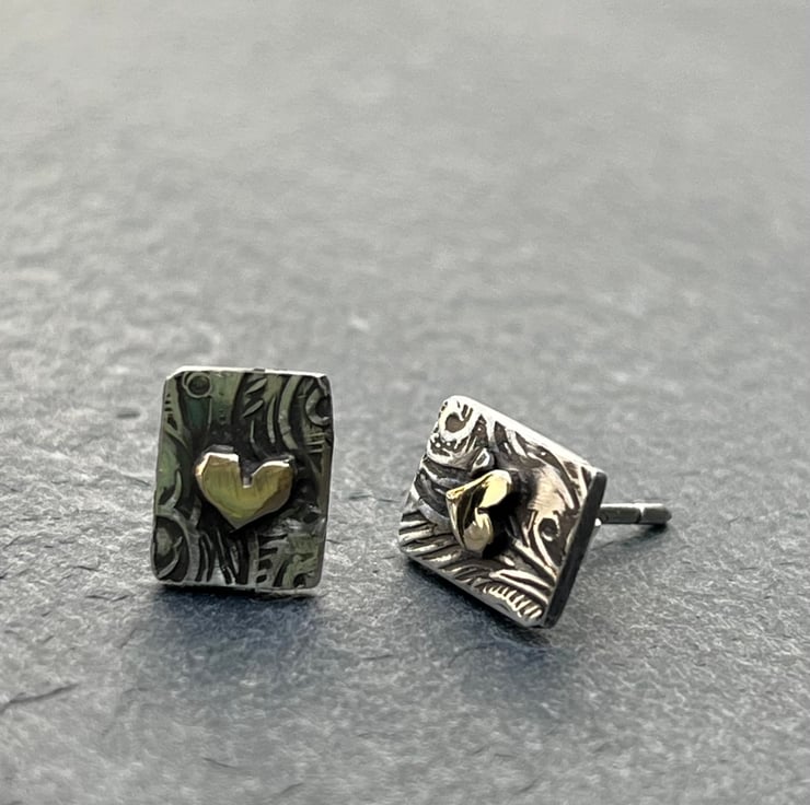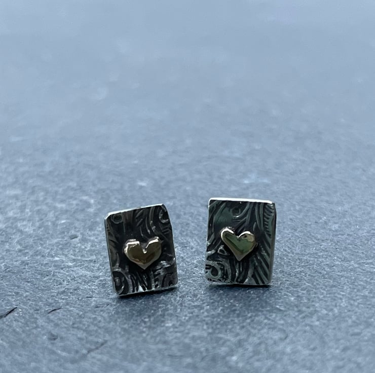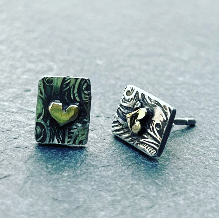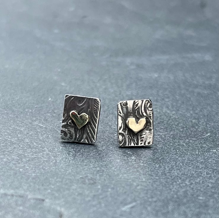 These gold heart studs are made from oxidised Sterling Silver with solid 9ct yellow gold hearts. The silver has been patterned with a florid design and the studs measure approximately: 9 x 7 mm in size. If you want the silver not oxidised, please let me know at Checkout. Posts and push on backs also Sterling Silver.