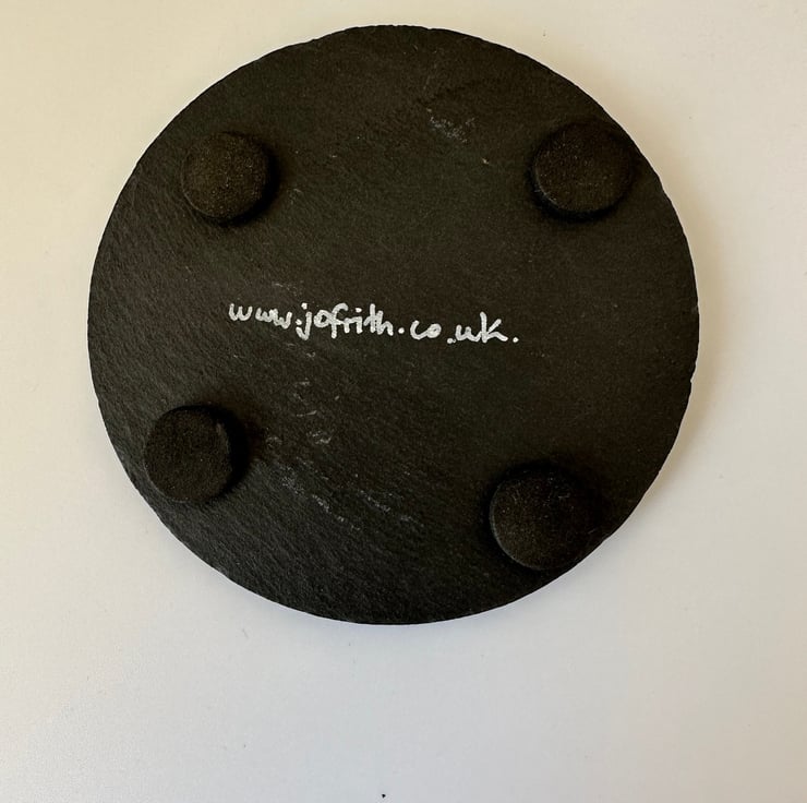 A set of 4 slate coasters with a mandala style design inspired by the lush green fields that can be seen as you wander around Glastonbury. These were hand painted in my Glastonbury Studio and finished in a heat resistant lacquer. They have rubber feet to protect your surfaces