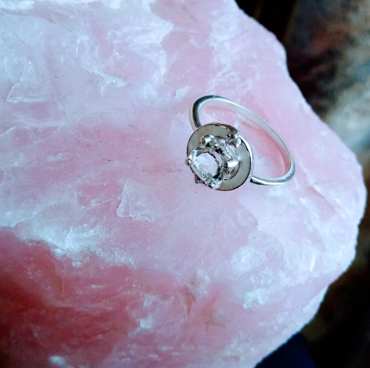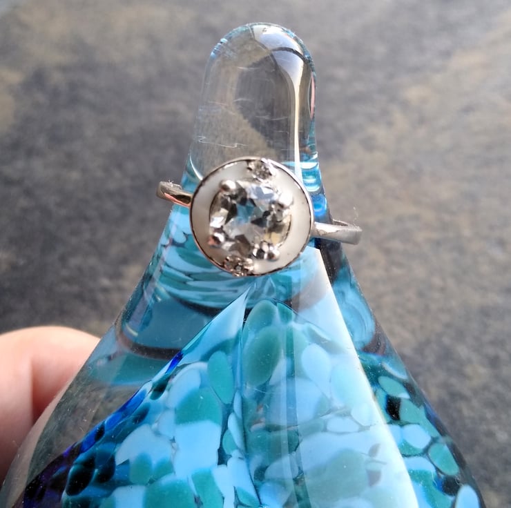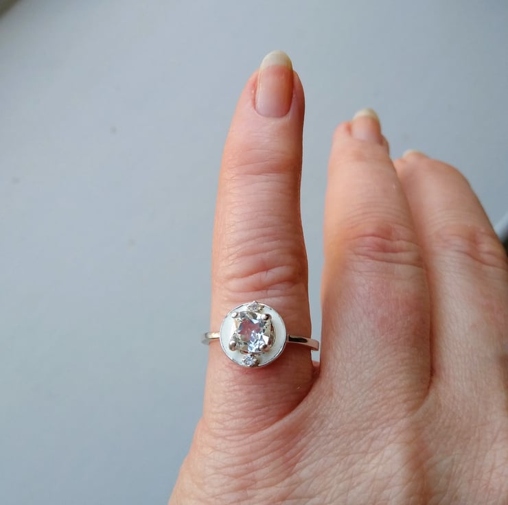 925 Sterling Silver and white enamel doughnut ring with a crystal clear faceted cushion 6mm Topaz stone of 1.40cts, brilliant cut and two 1.75mm faceted Topaz accent stones.