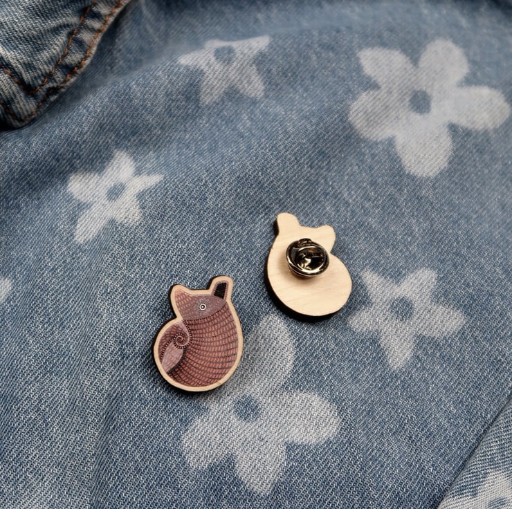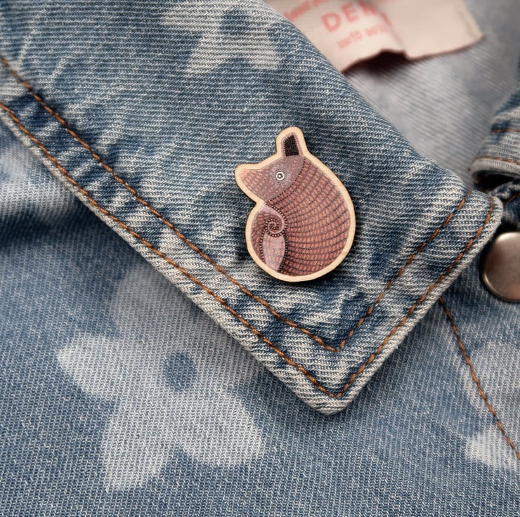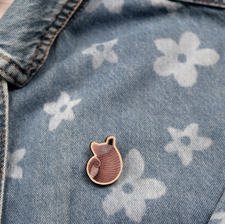 Armadillo wooden pin badge, gift for animal lover, cute brooch.