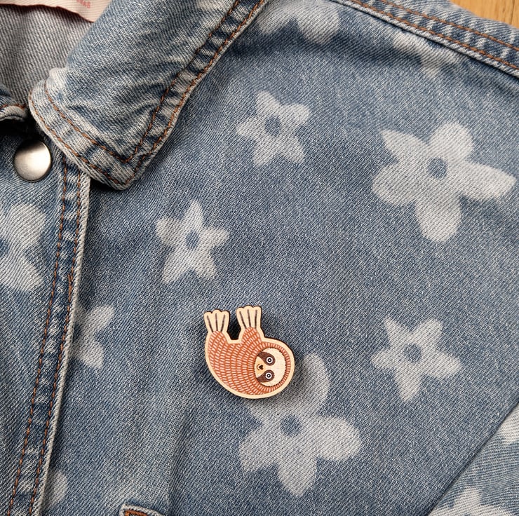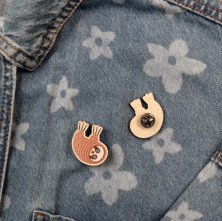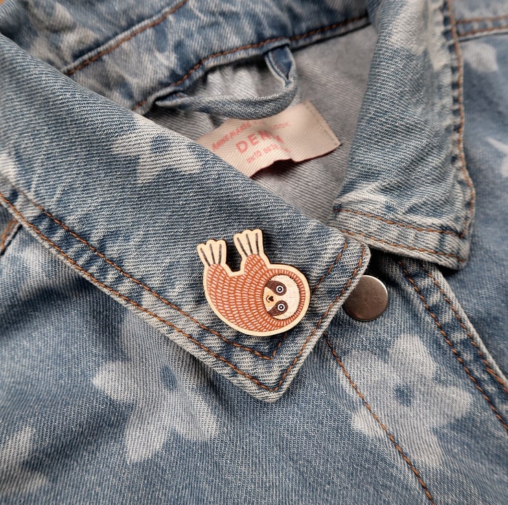 Beautiful wooden SLOTH wooden pin badge.