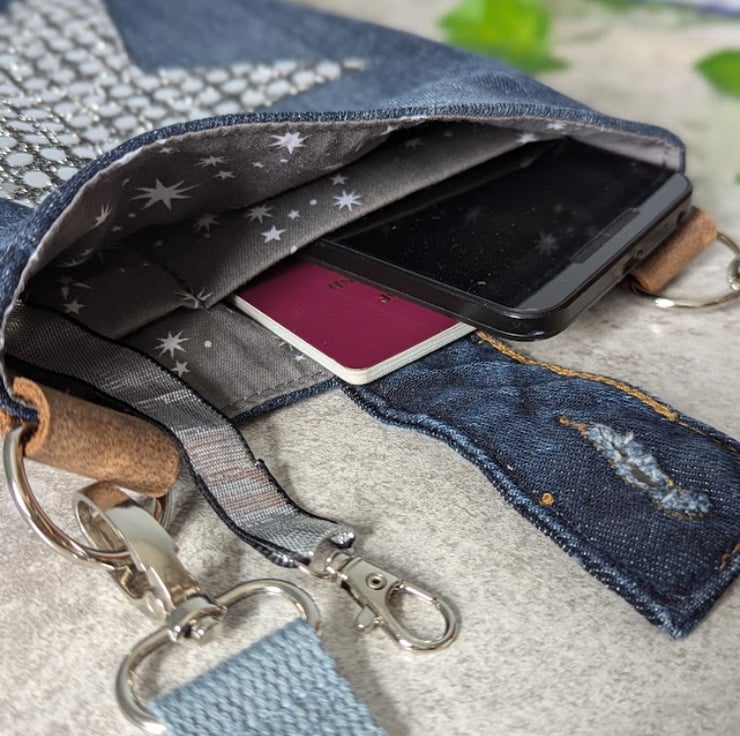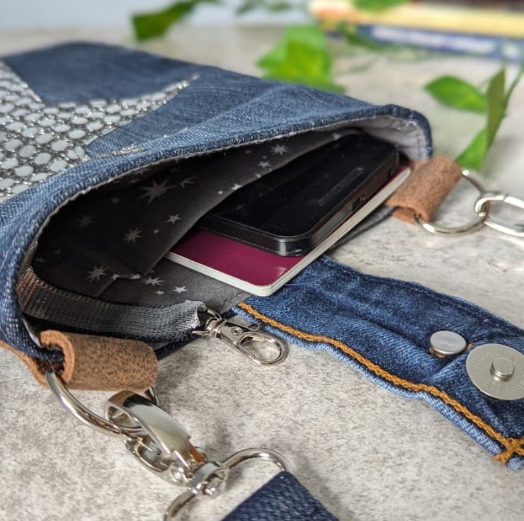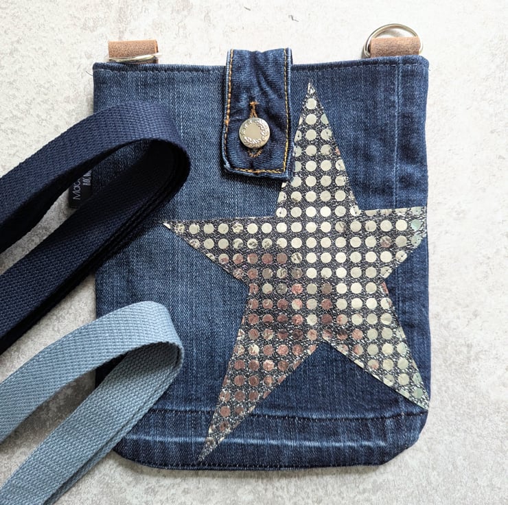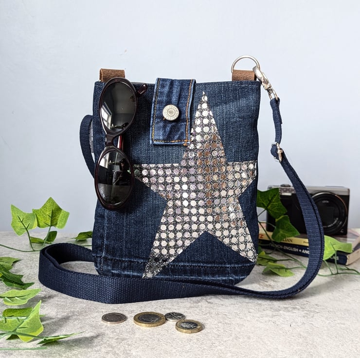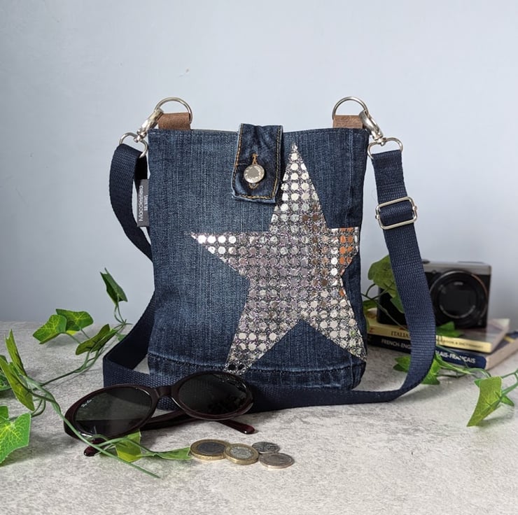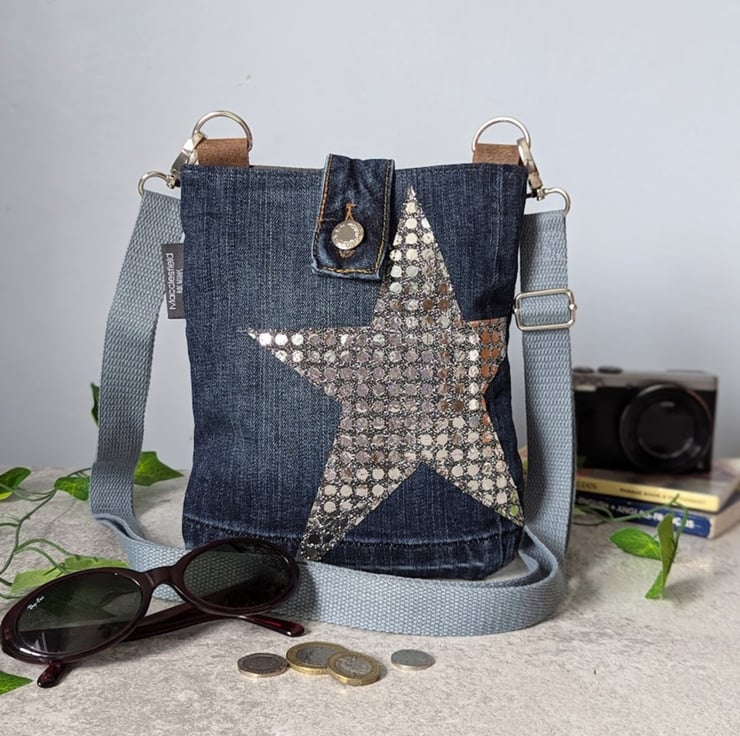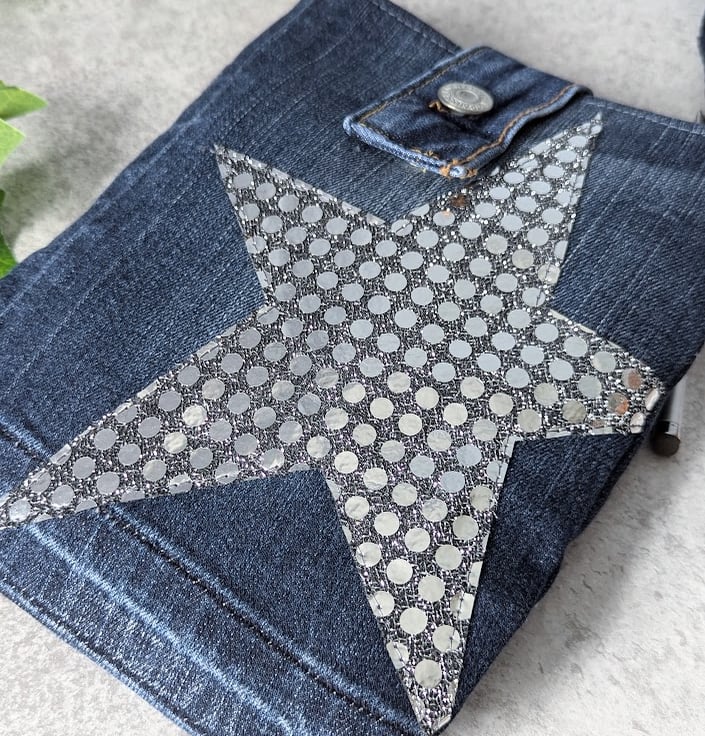 Preloved denim jeans have been reimagined to make this mini cross body bag. With a gorgeous silver faux sequin star motif, it's perfect for evenings, festivals or just feeling fabulous every single day! Throw in your phone, purse and a few essentials, this little bag has been designed to be light, casual and convenient.