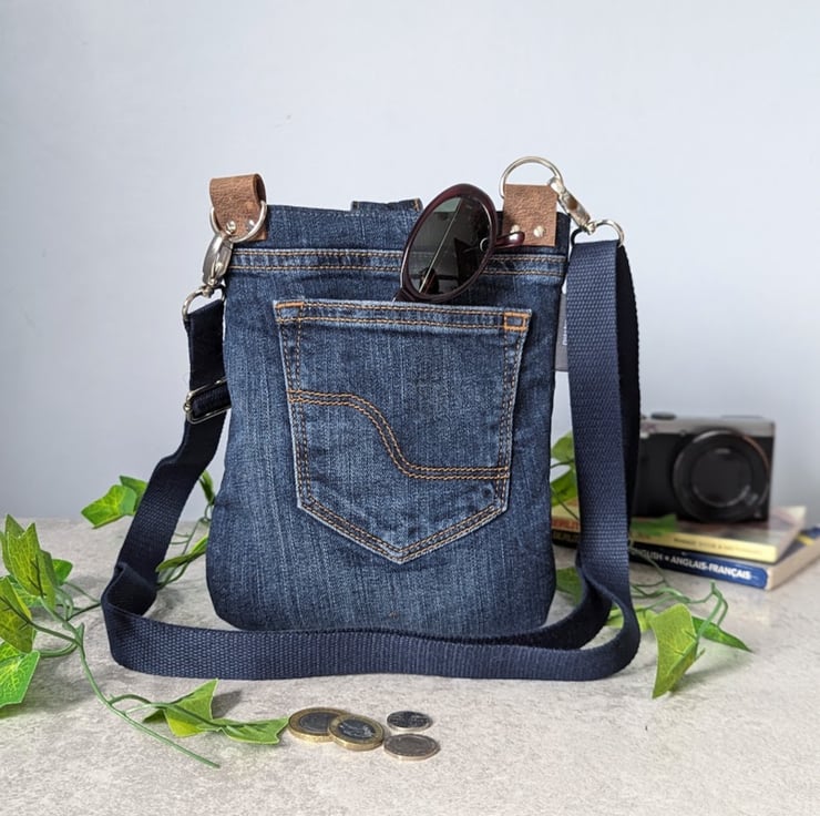 Handmade, and reducing waste by using pieces of recycled denim jeans that are no longer wanted, I've made the most of the character of the denim with the back of the bag having a usable jeans pocket.