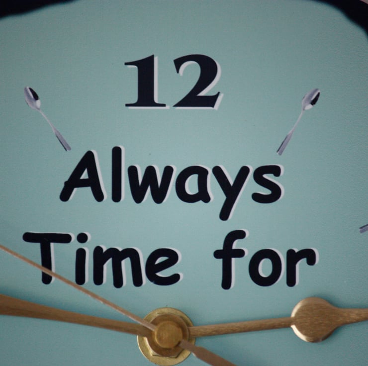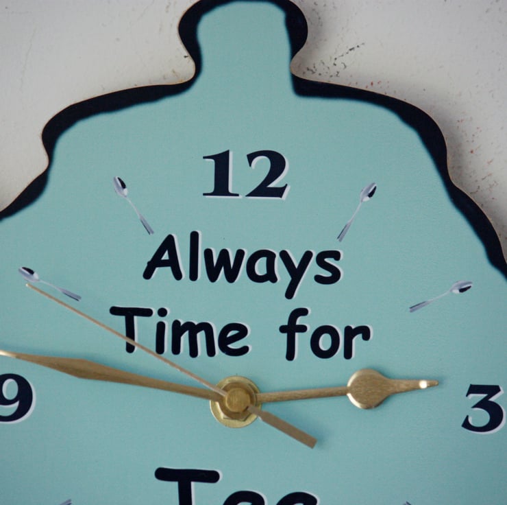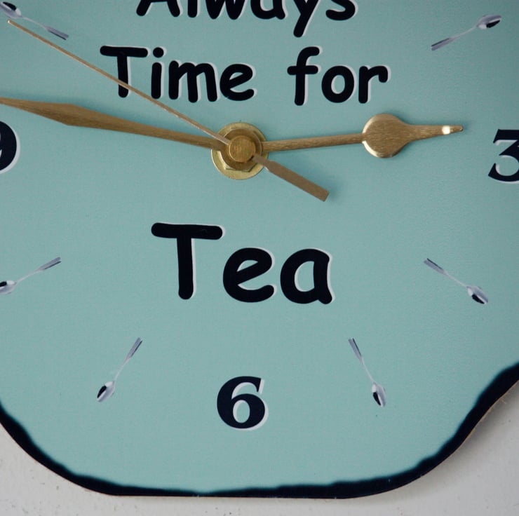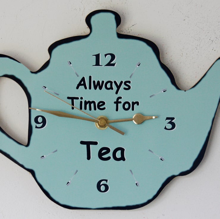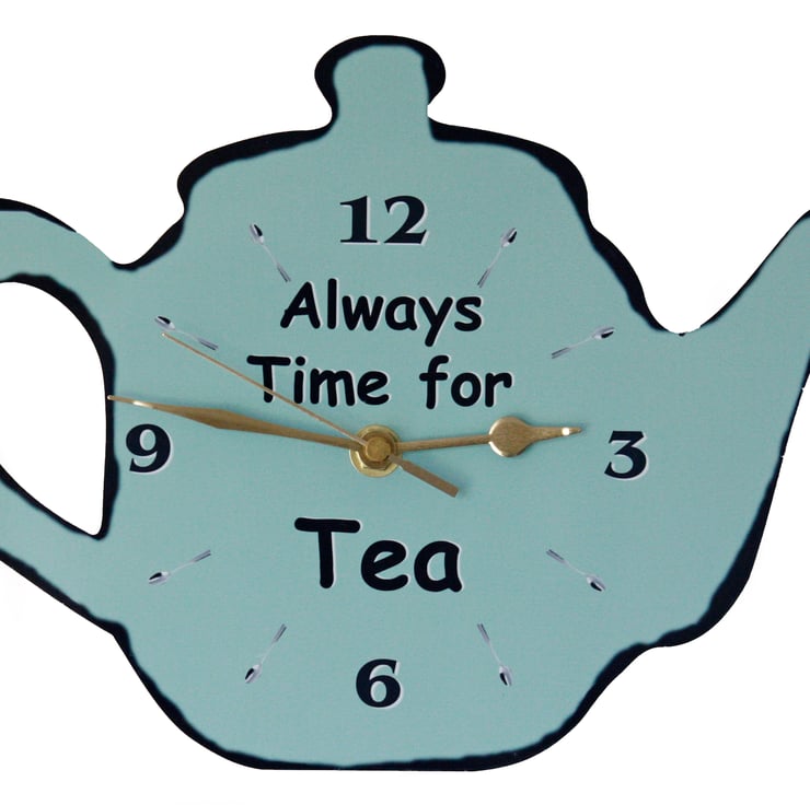 This clock is in the shape of a Tea Pot and is approx 20cm high and 29cm wide. It can be hung on the wall using the hanger on the clock mechanism. The dial is a mixture of numbers and tea spoons.