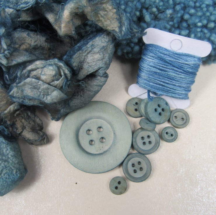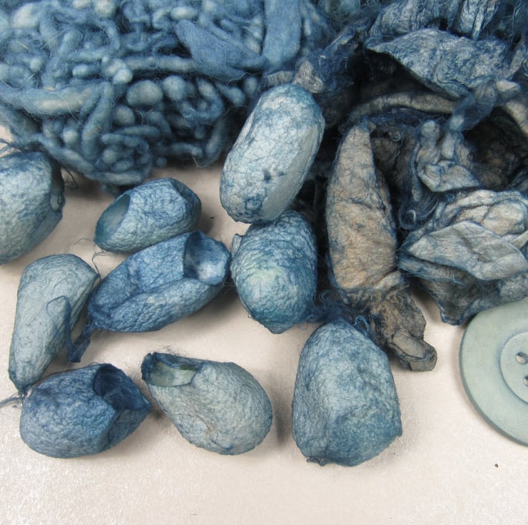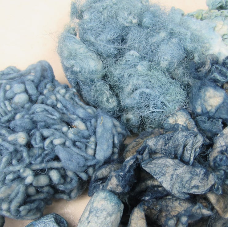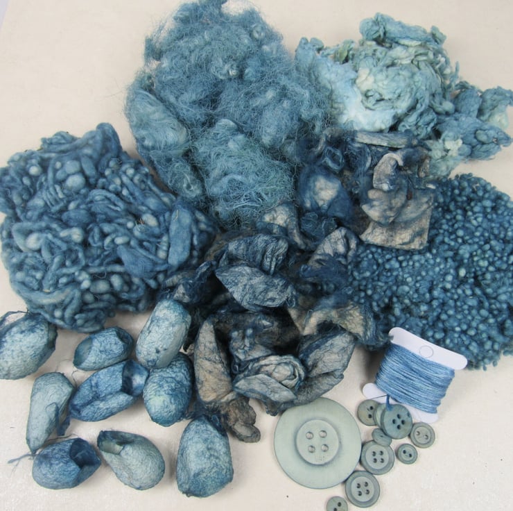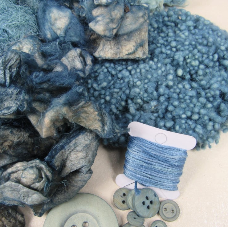 A collection of mixed natural fibres and textures, carefully dyed with indigo.