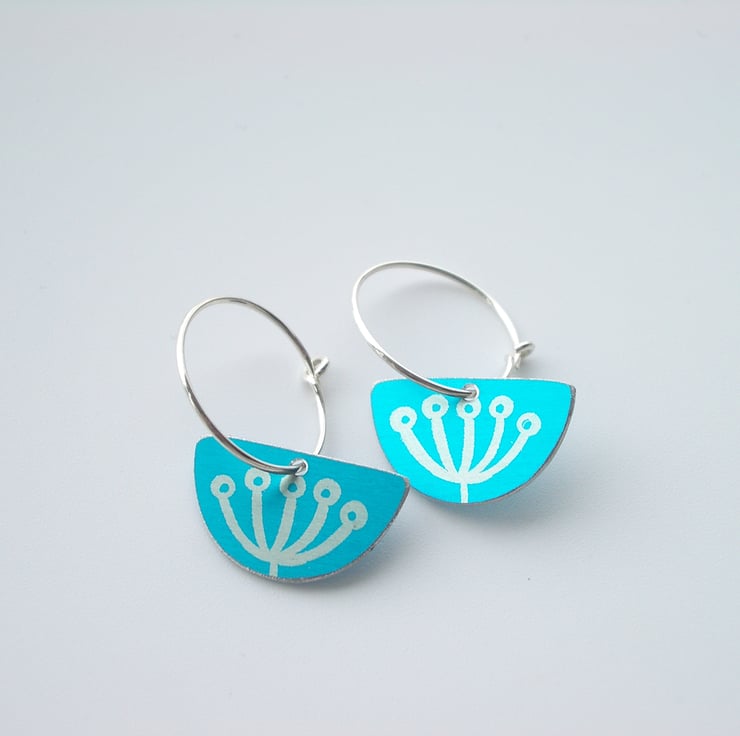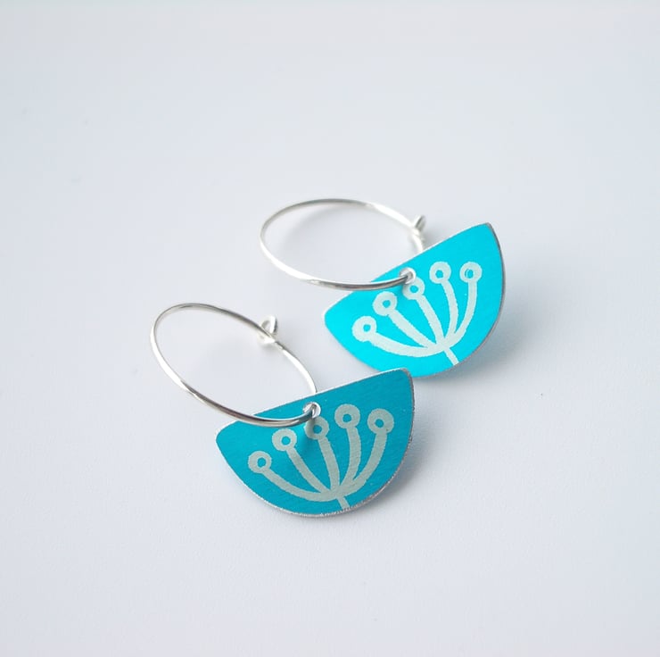 These cute little semi circle earrings are made from aluminium which I have a dyed in turquoise and printed with silver cow parsley prints. The dye is made permanent through heat and the colour becomes part of the metal. I cut out the semi circle shapes by hand using a jewellers saw and file the edges to give a nice finish. Finally I have hung them on 15mm sterling silver hoops. The semi circles measure approximately 17mm x 10mm.