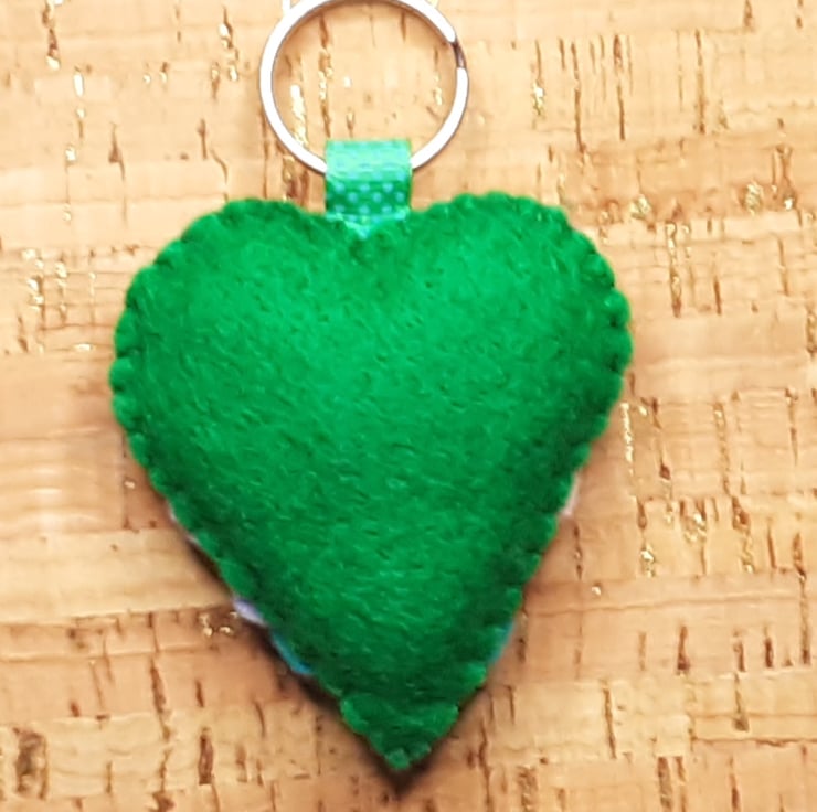The main colour of the heart is dark green with six different coloured flowers stitched to the front (Light blue, dark turquoise, lavender, purple, light pink & dark pink).